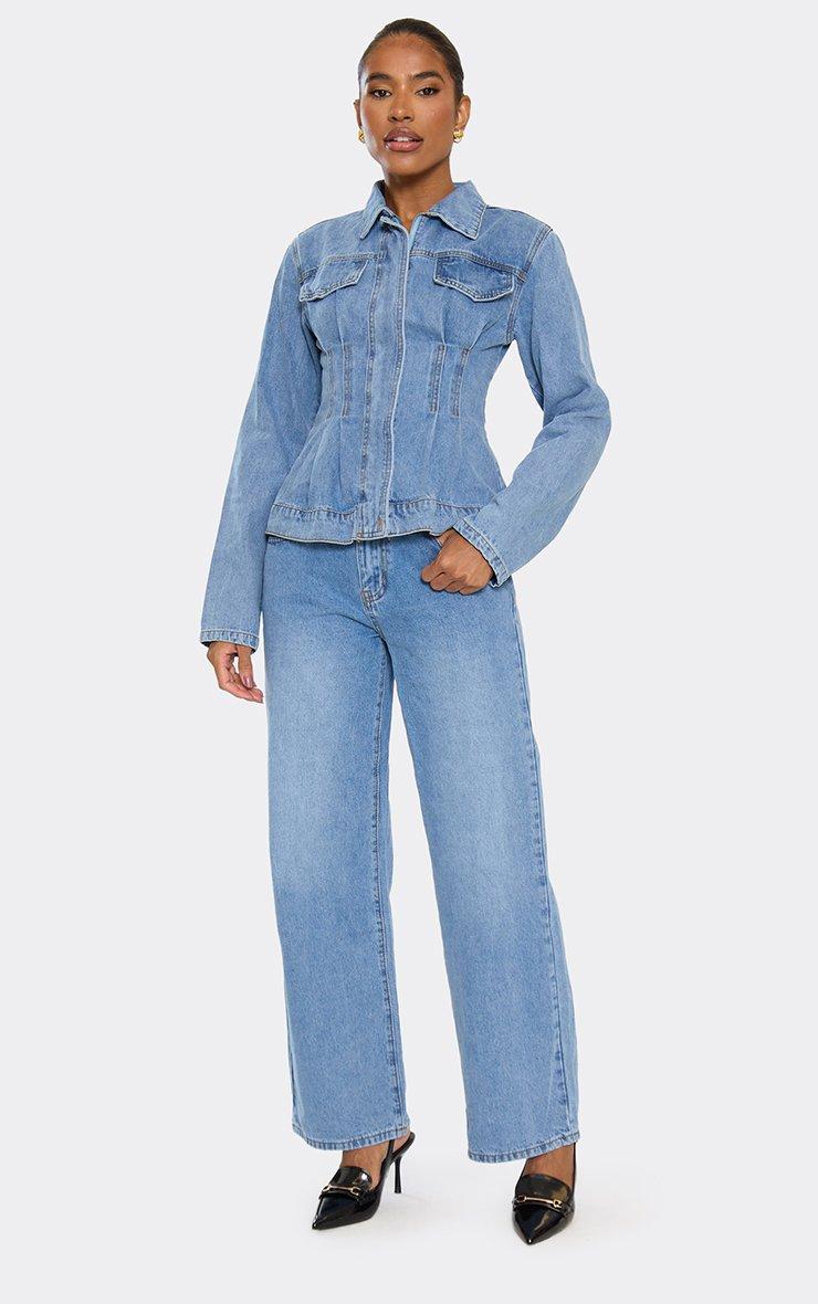 Long Sleeve Seam Detail Cinched Waist Jacket In Blue Wash Denim