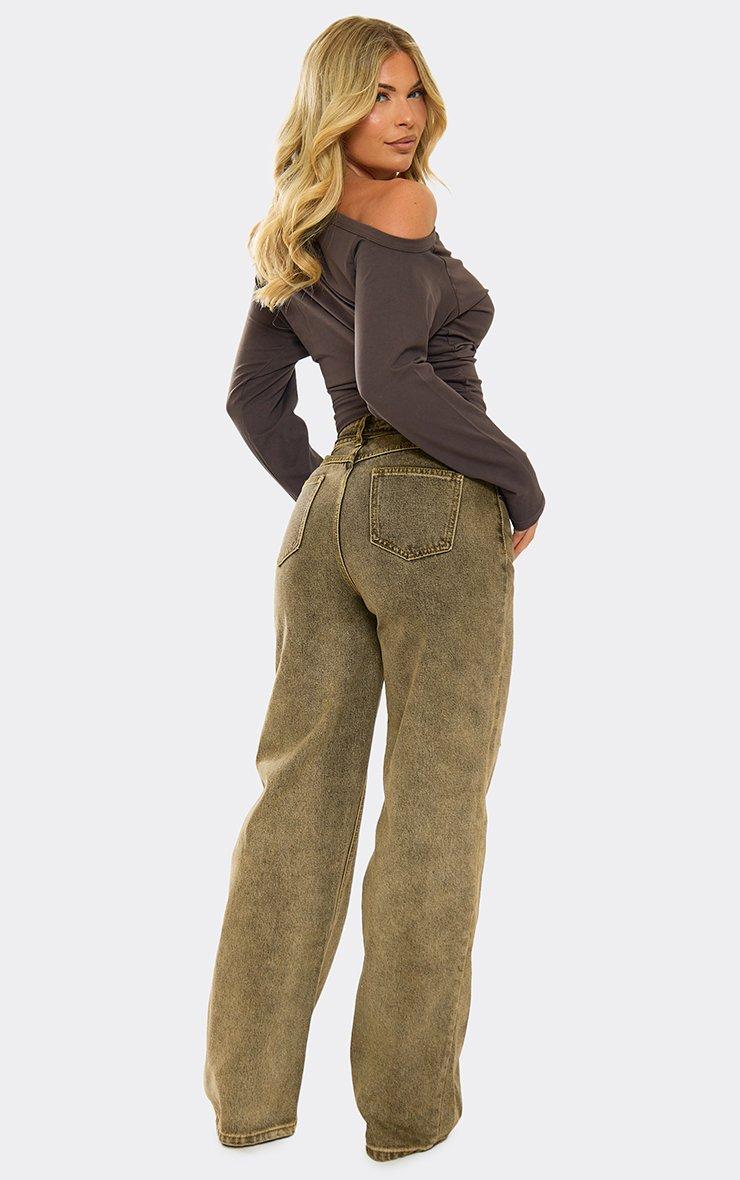Low Rise Logo Pattern Detail Wide Leg Jeans In Brown Denim