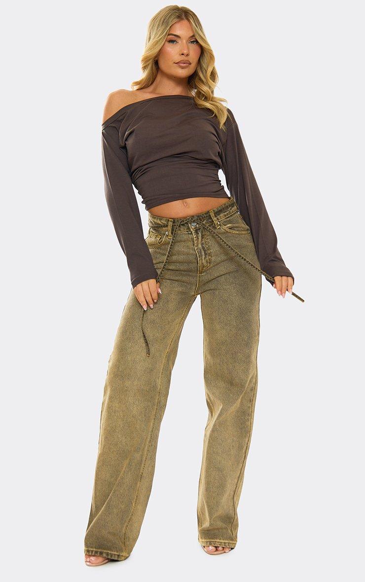 Low Rise Studded Patch Detail Wide Leg Jeans In Brown Denim