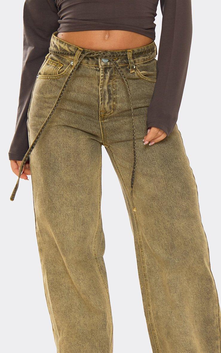 mid rise tie belt detail straight leg jeans in washed brown denim