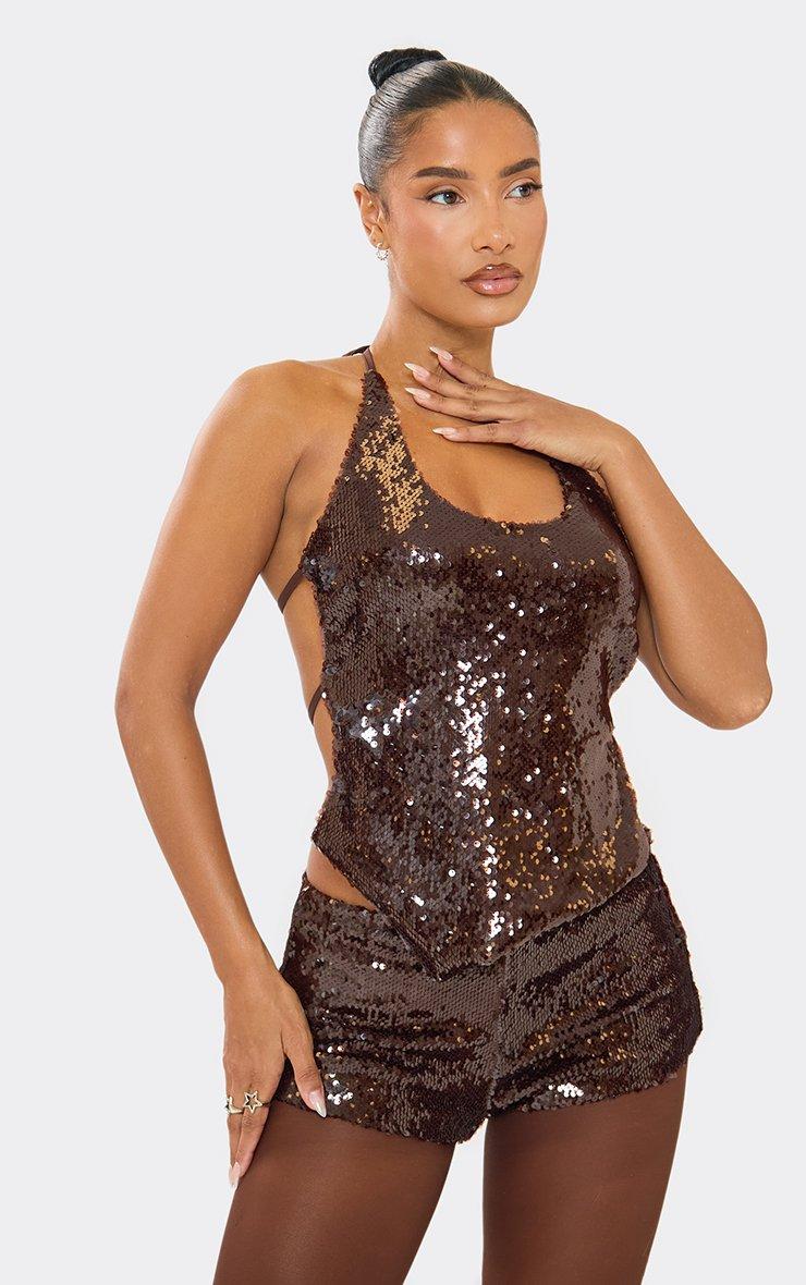 Halterneck Asymmetric Hem Strappy Back Detail Top In Chocolate Brown Sequin