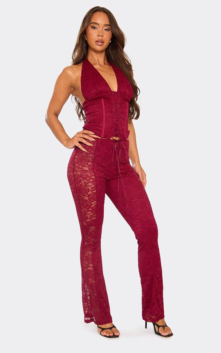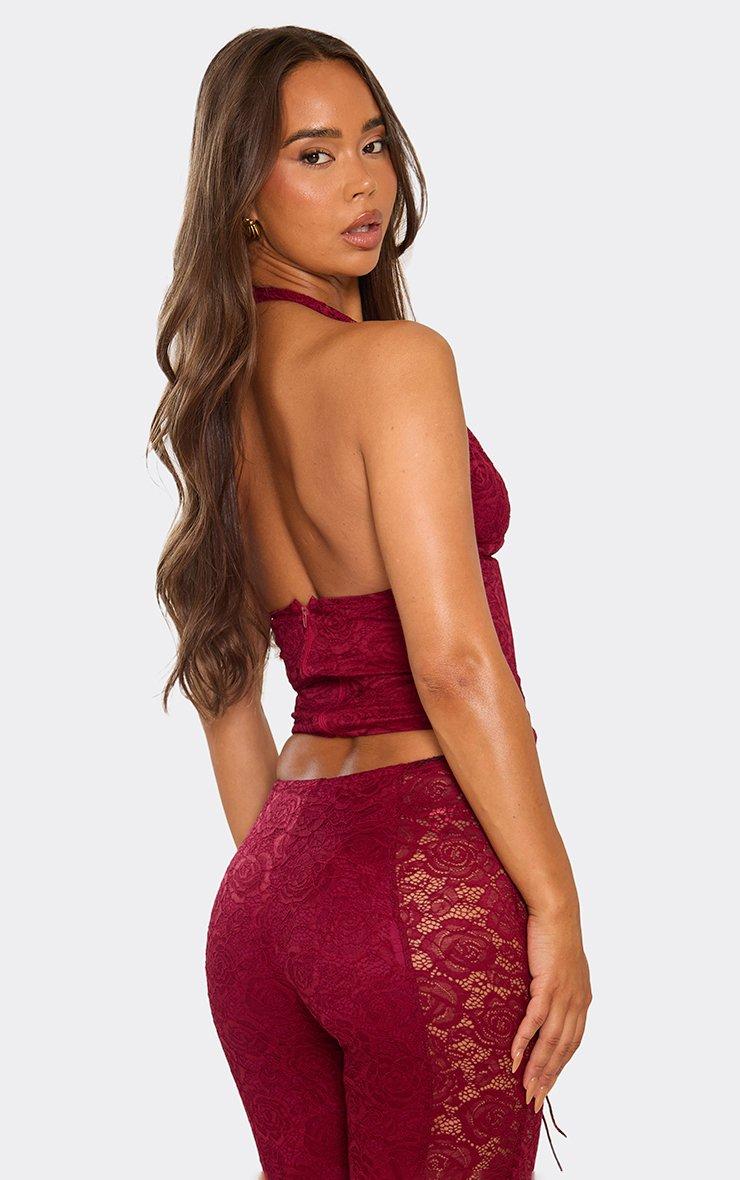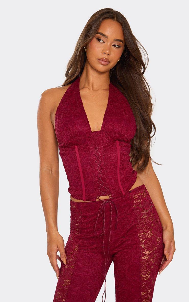Halterneck Lace Up Corset Top In Burgundy Lace