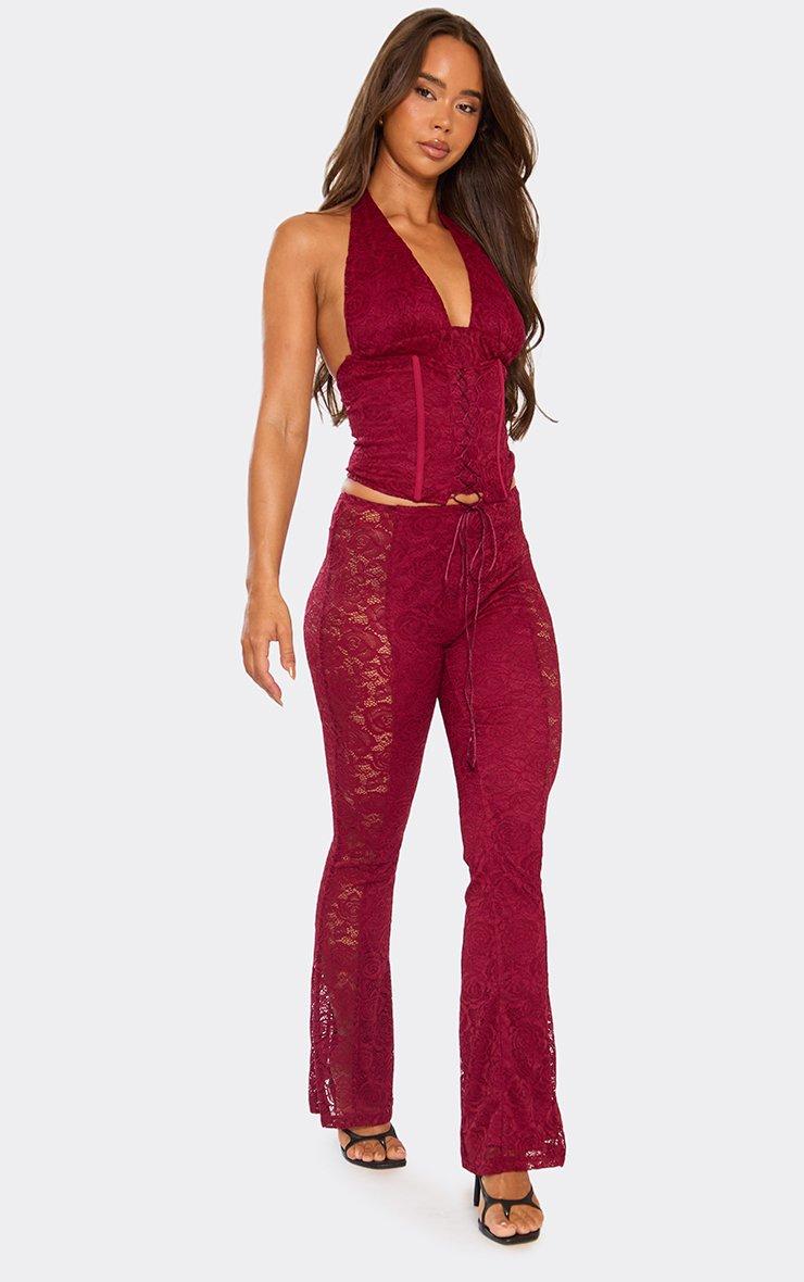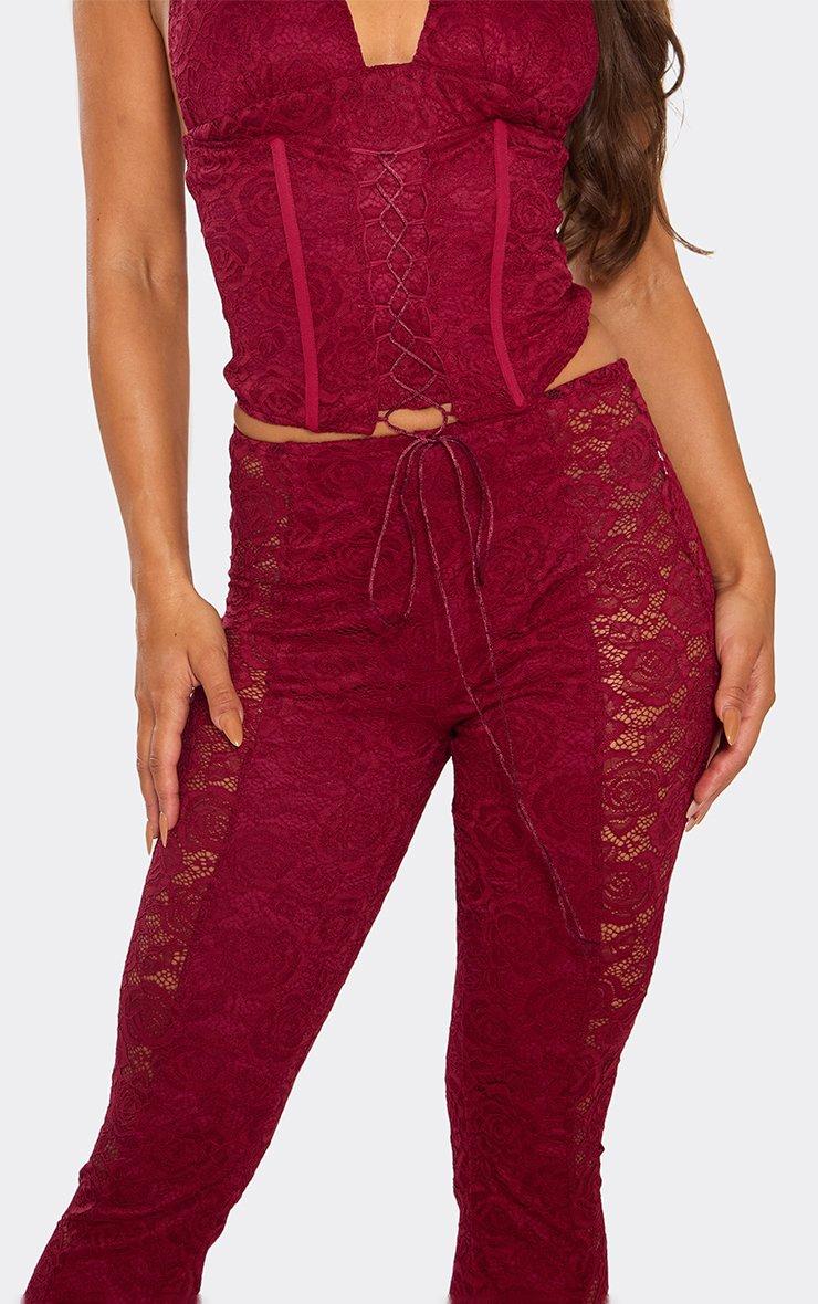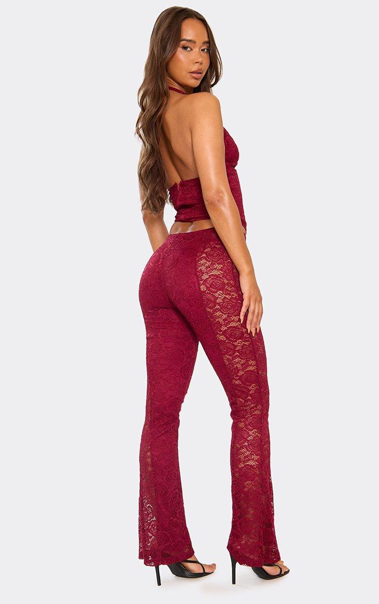 Mid Rise Kick Flare Trousers In Burgundy Red Floral Lace