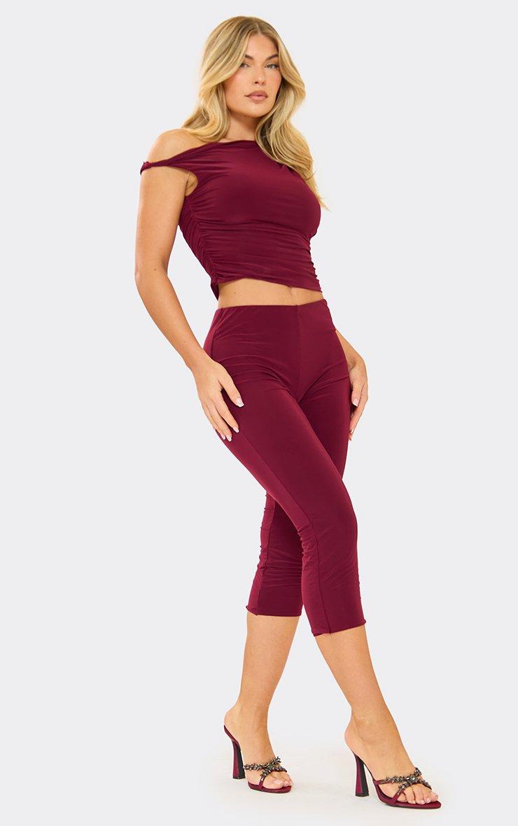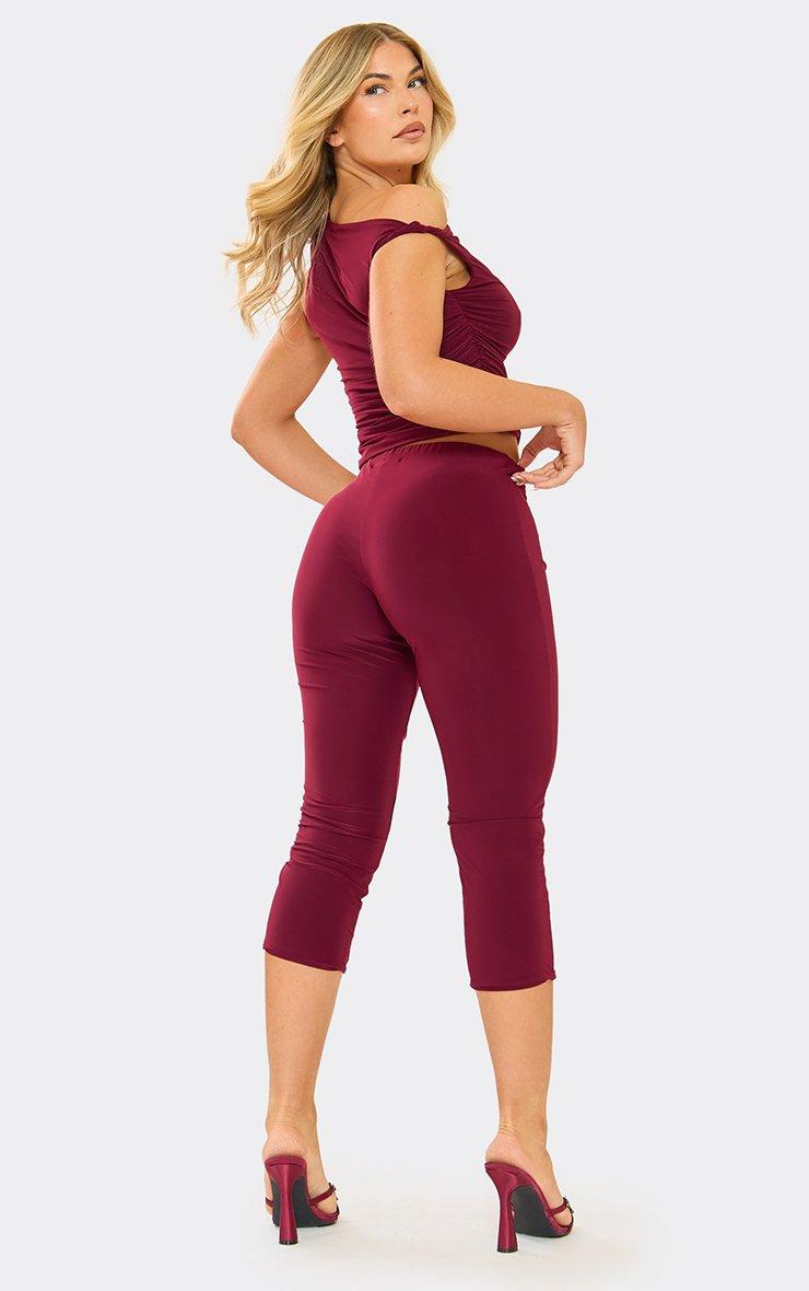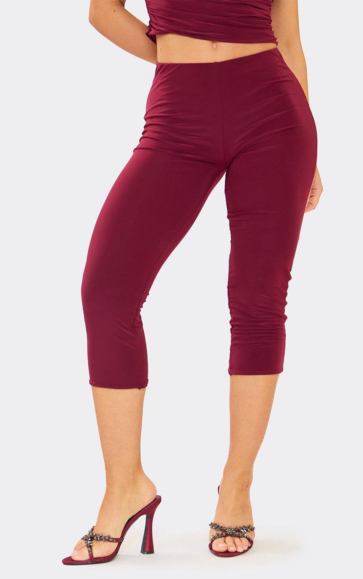 Drawstring Waist Detail Straight Leg Trousers In Burgundy Ribbed