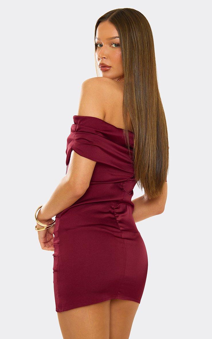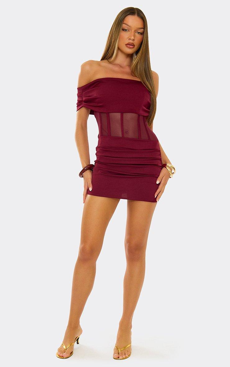 Bardot Ruched Boning Detail Mini Dress In Burgundy