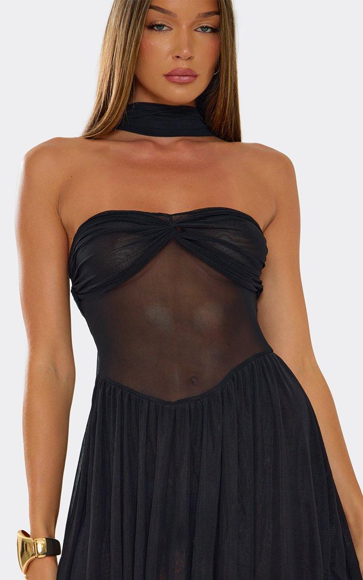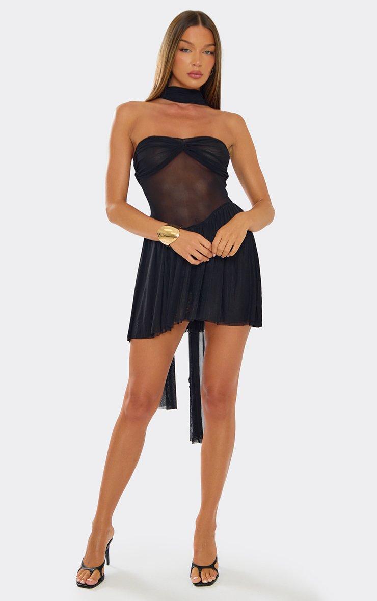 Scarf Neck Twist Bust Frilled Hem Detail Mini Dress In Black