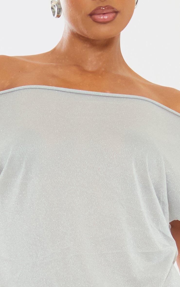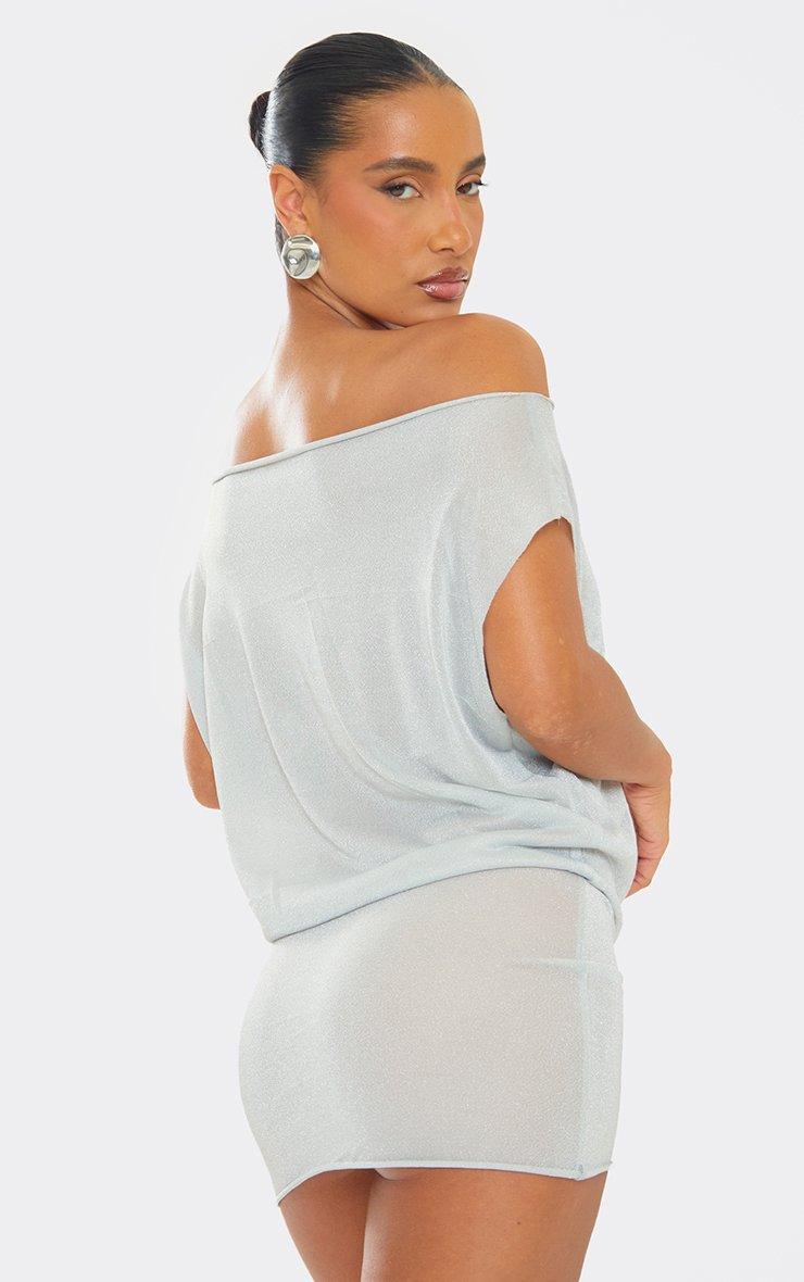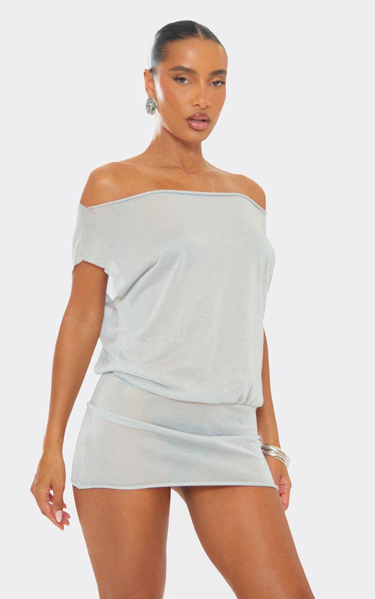 Off The Shoulder Drape Fitted Hem Detail Mini Dress In Silver Shimmer