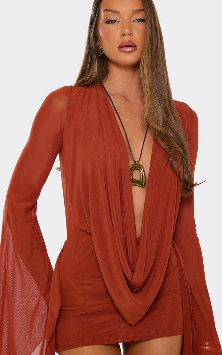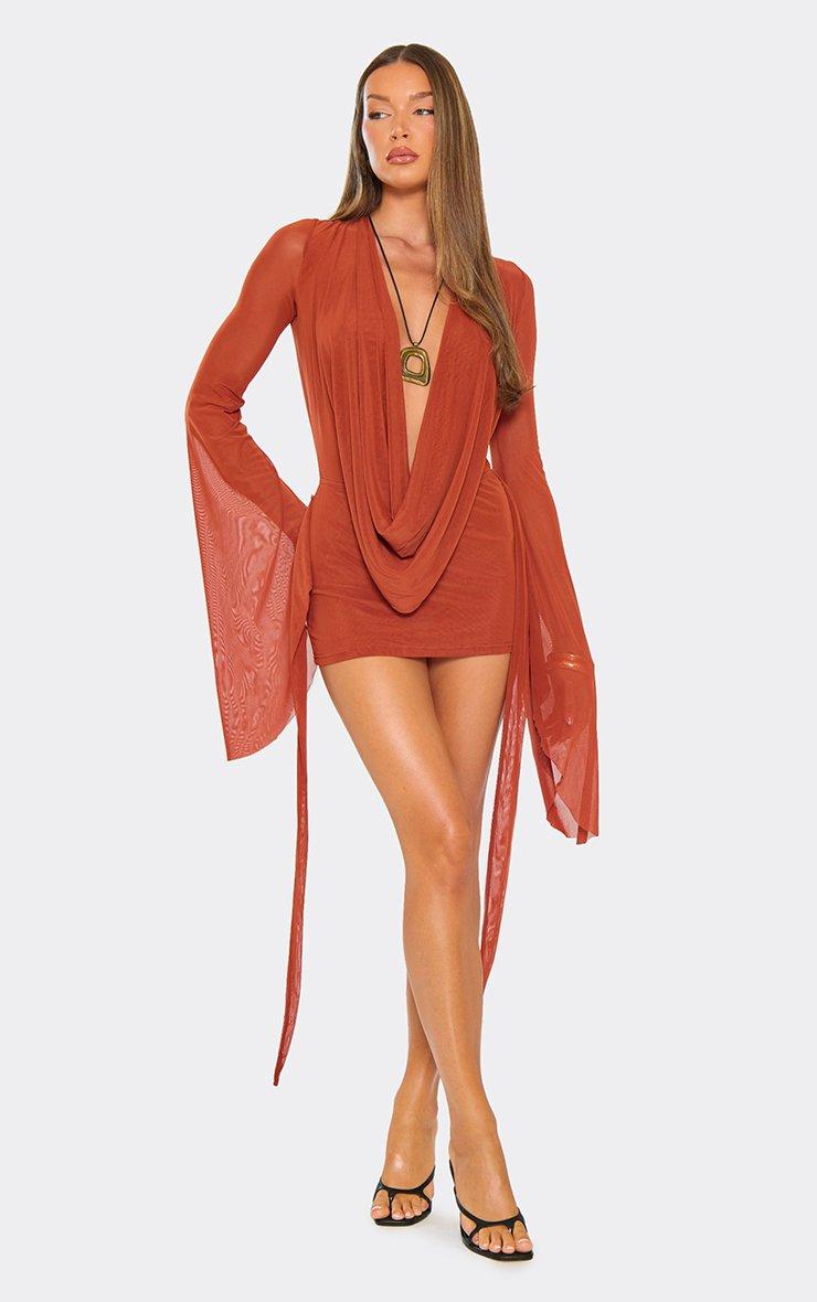 Exaggerated Sleeve Cowl Neck Open Tie Back Detail Mini Dress In Rust