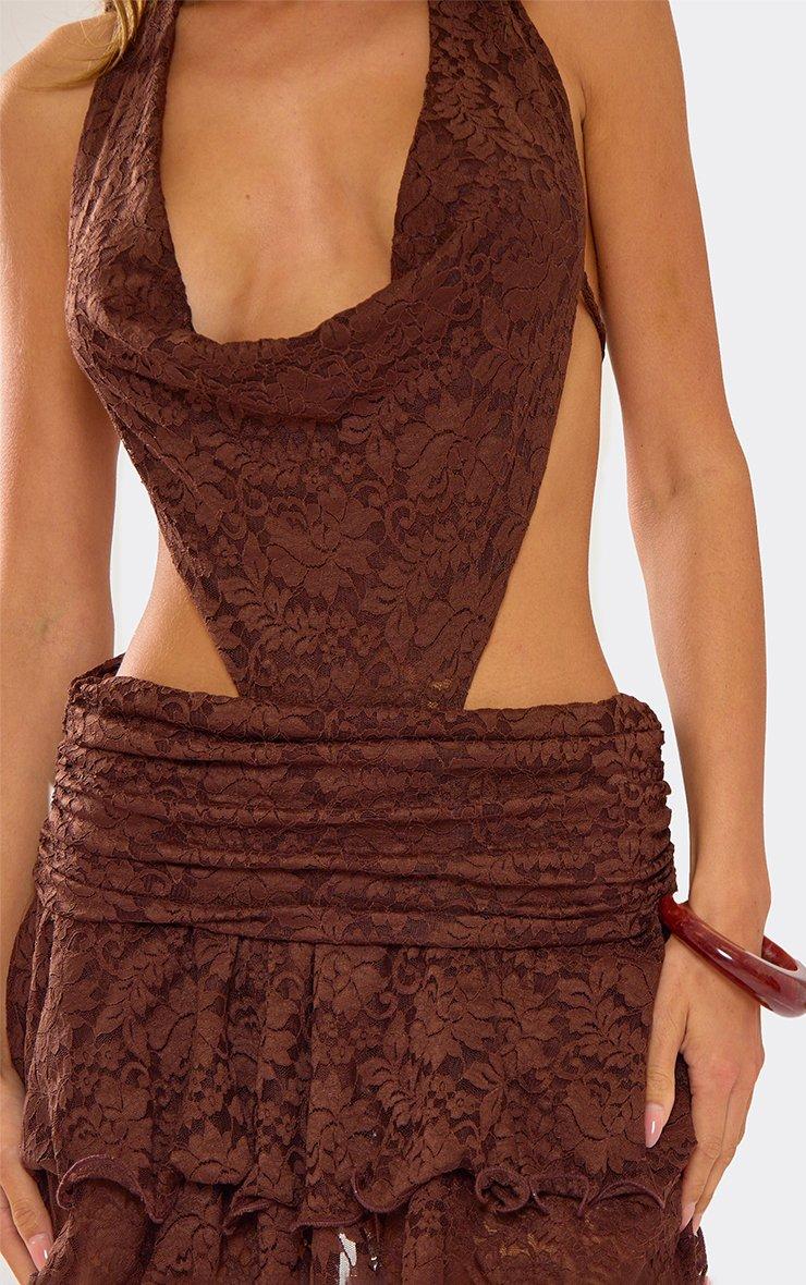 cowl neck frill hem cut out side detail mini dress in chocolate brown
