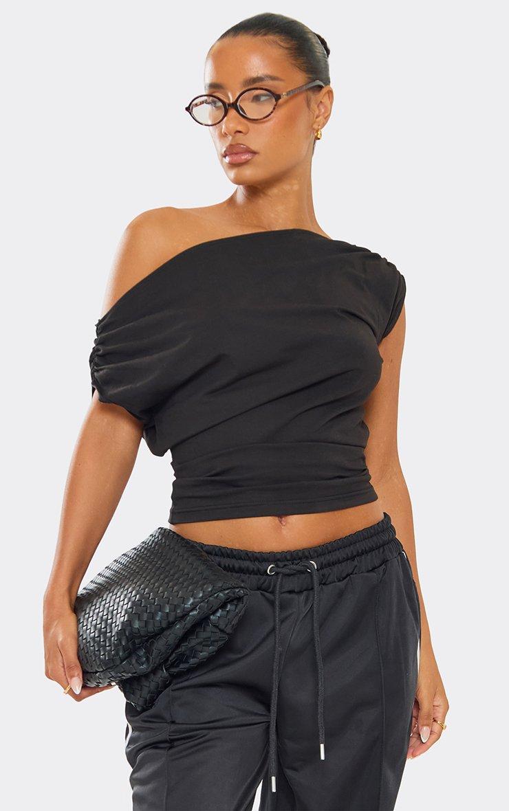 slash neck off the shoulder cinched waist ruched t-shirt in black