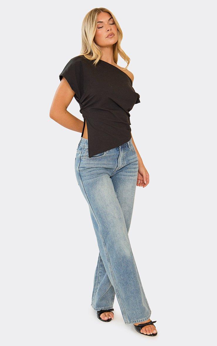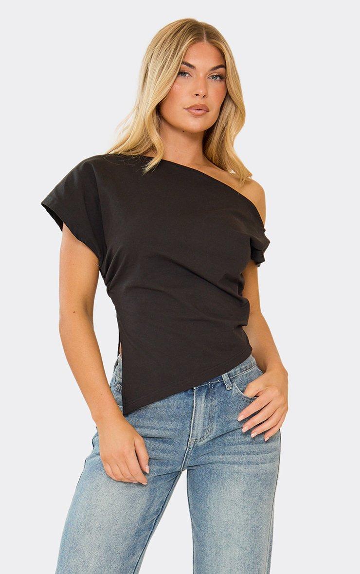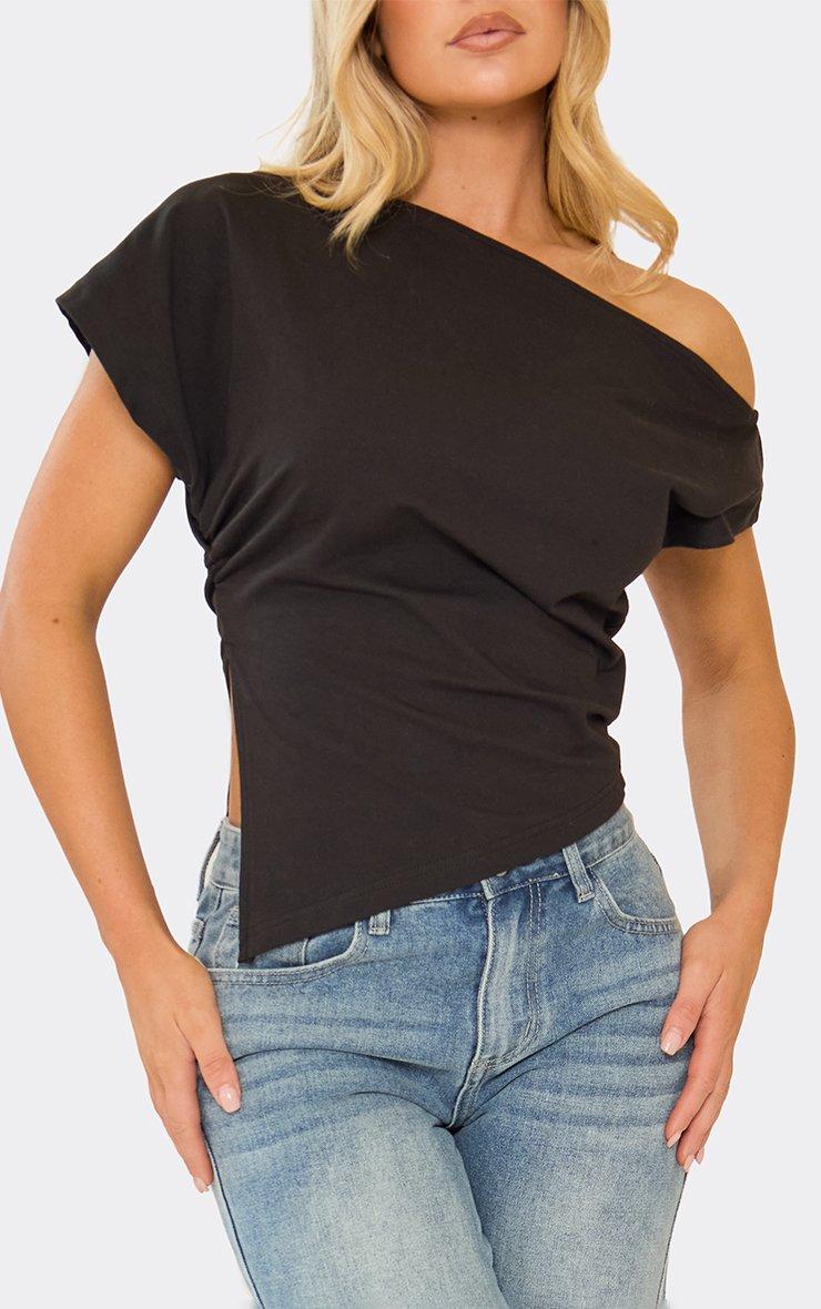 Slash Neck Off The Shoulder Cinched Waist Ruched T-Shirt In Black