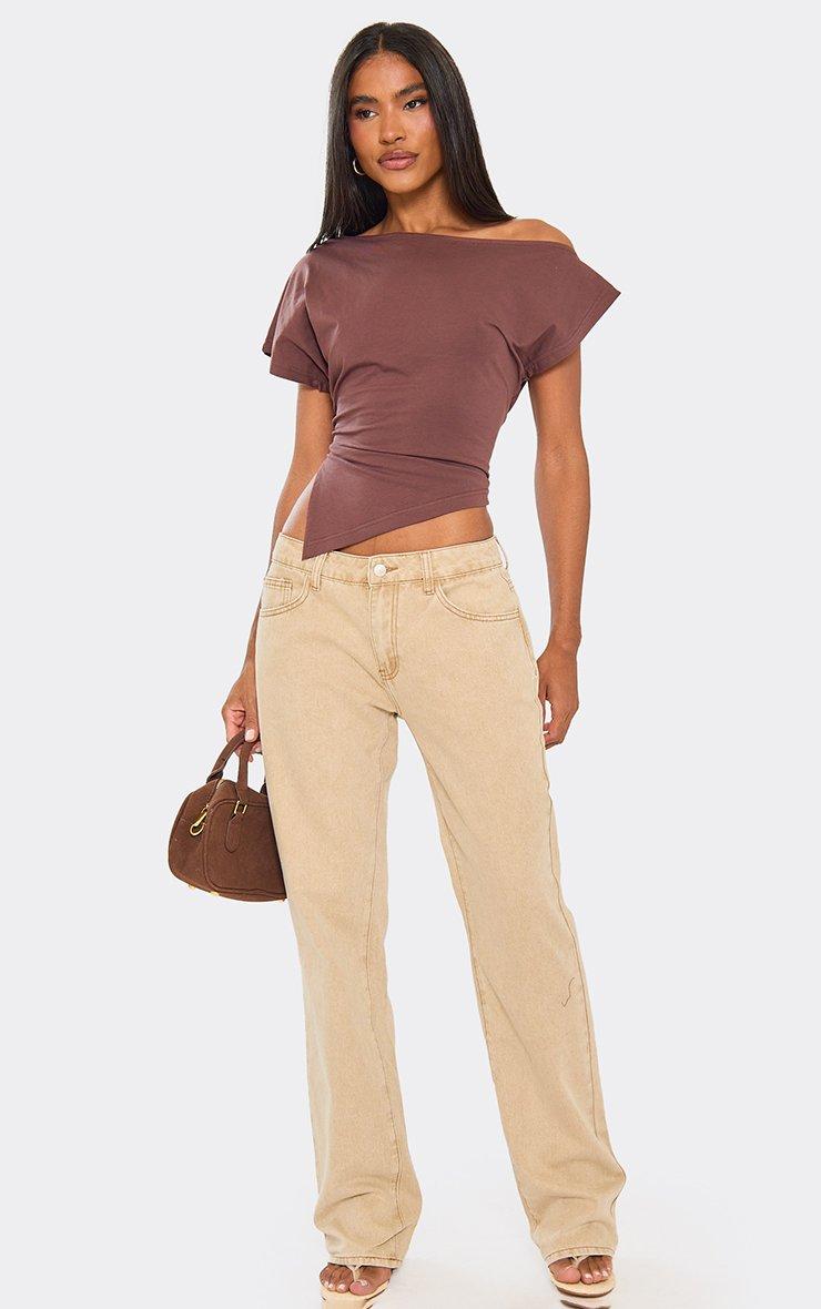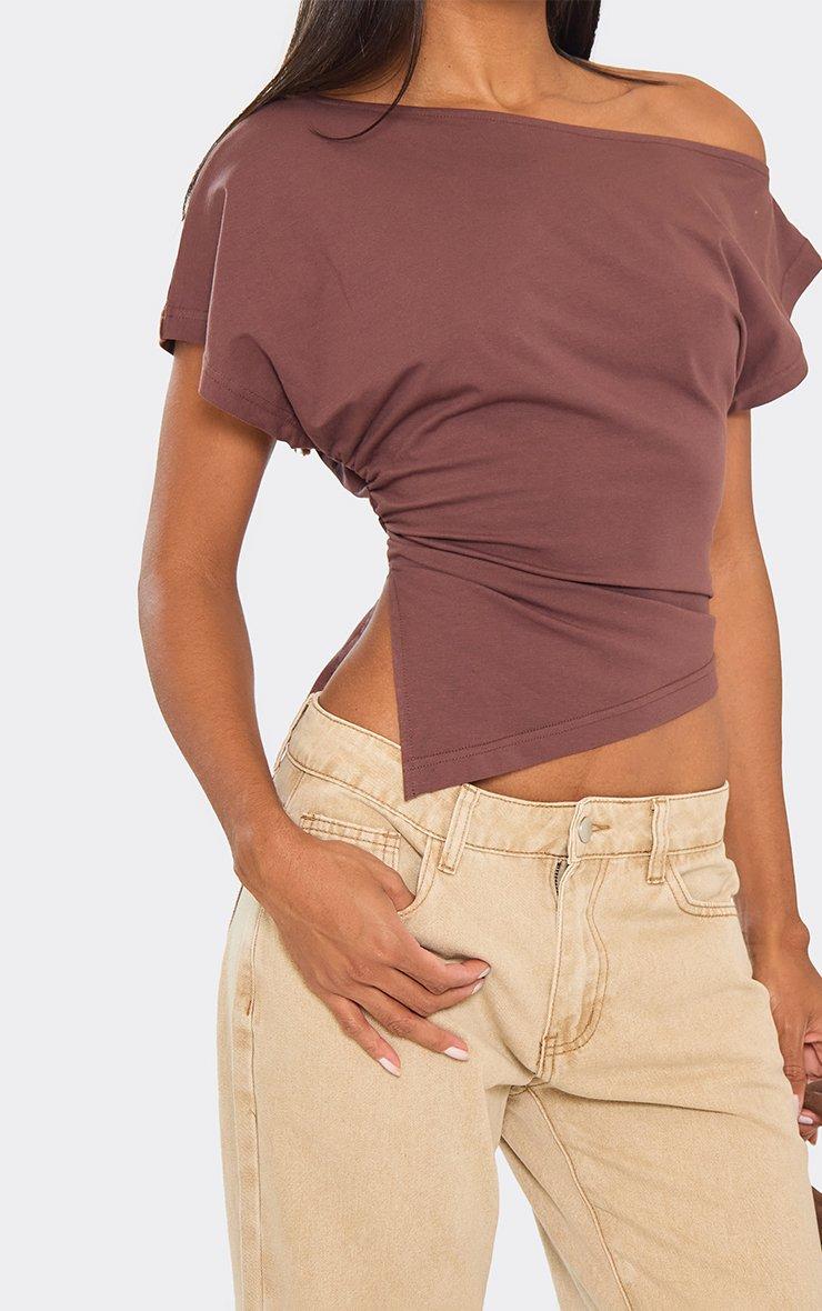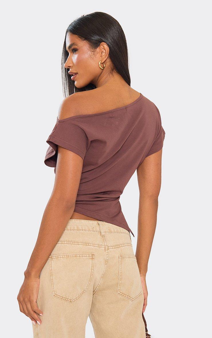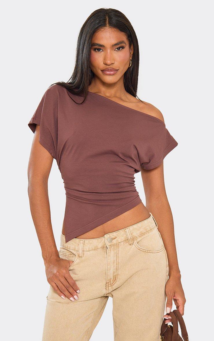 Slash Neck Asymmetric Dipped Hem T-Shirt In Chocolate Brown
