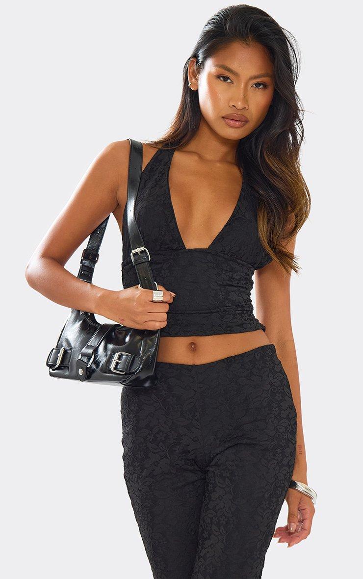 Plunge Halterneck Lace Up Zip Front Detail Top In Black
