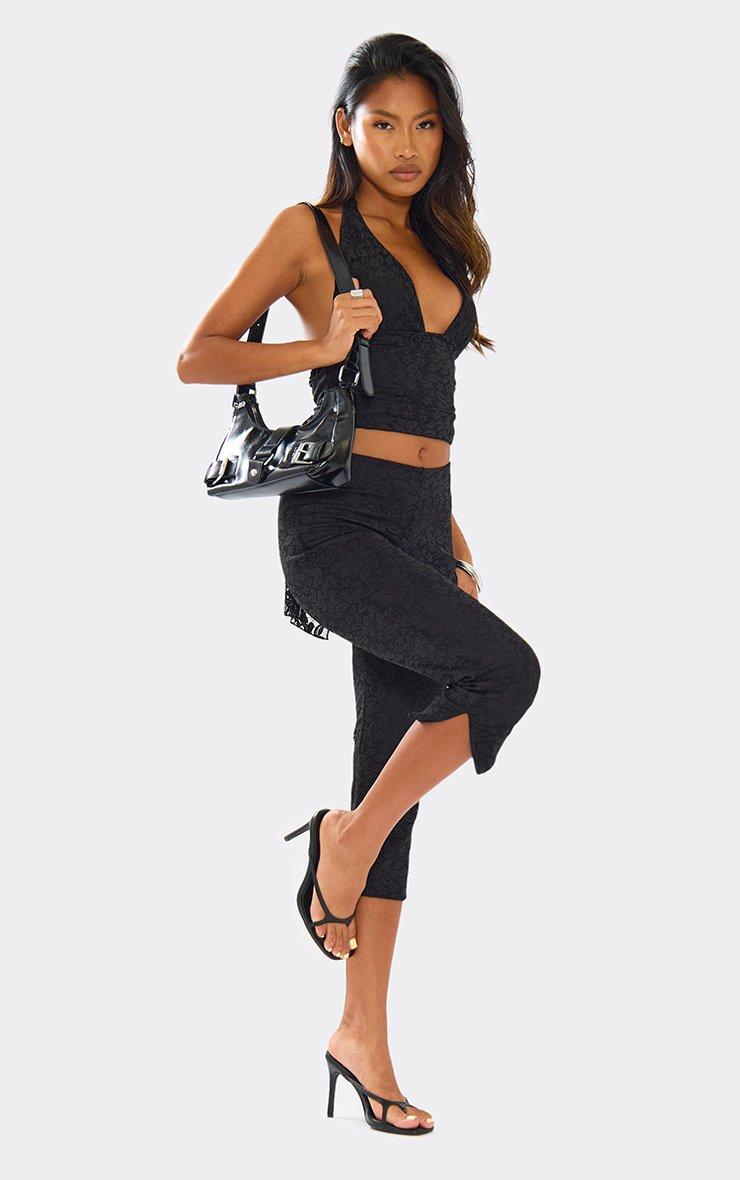 Halterneck Tie Waist Detail Top In Black Floral Lace