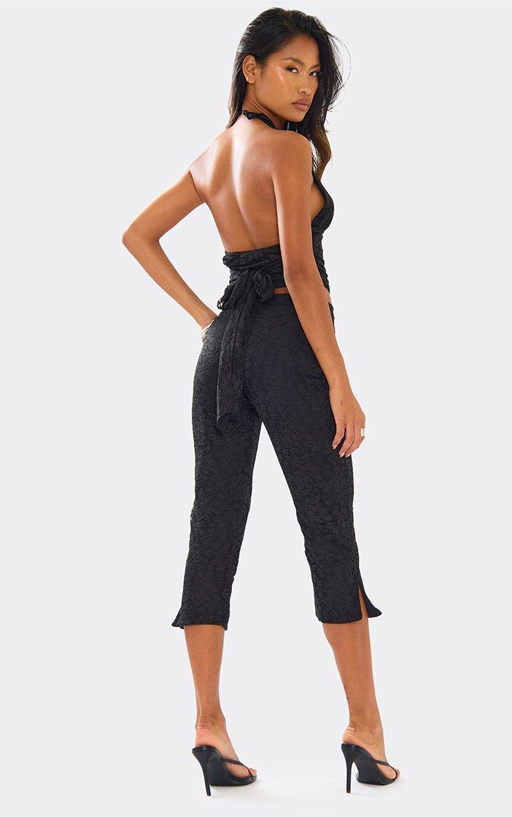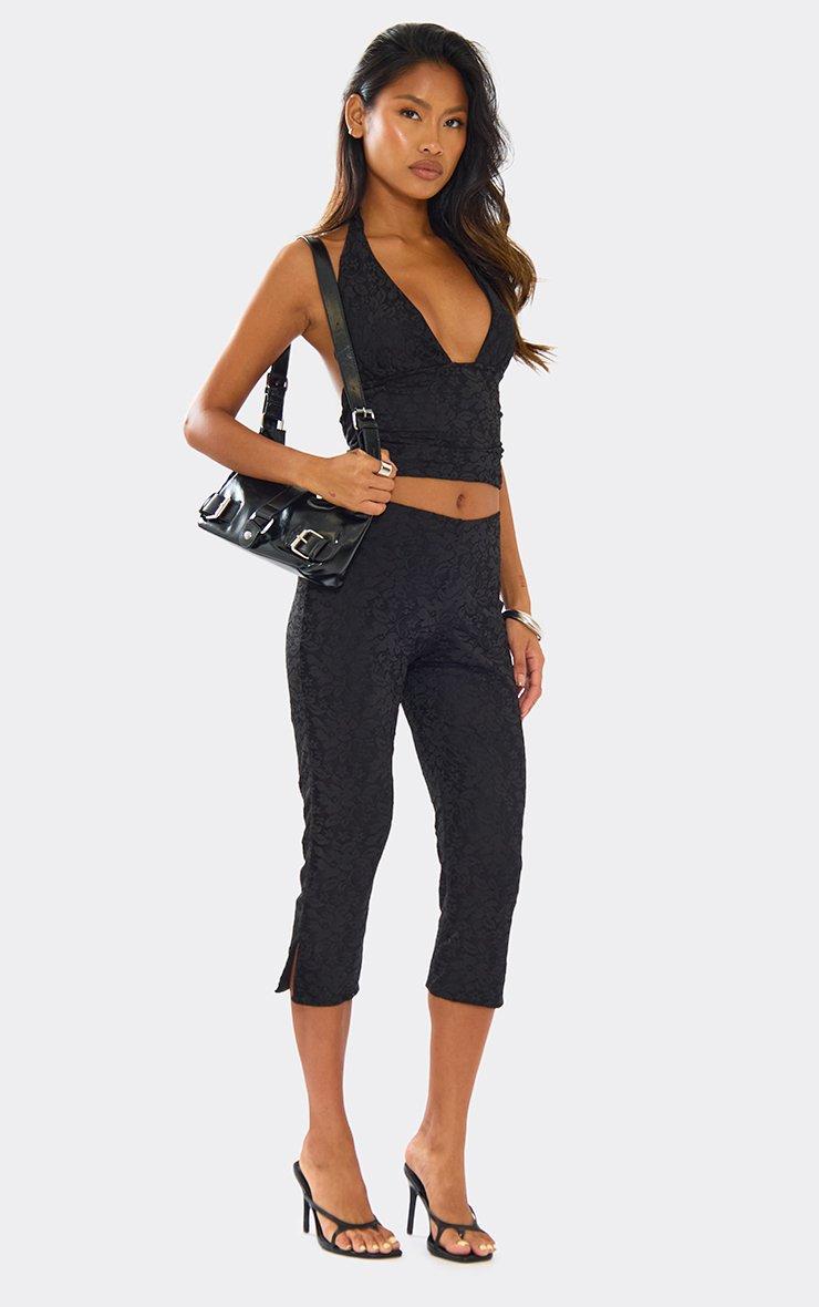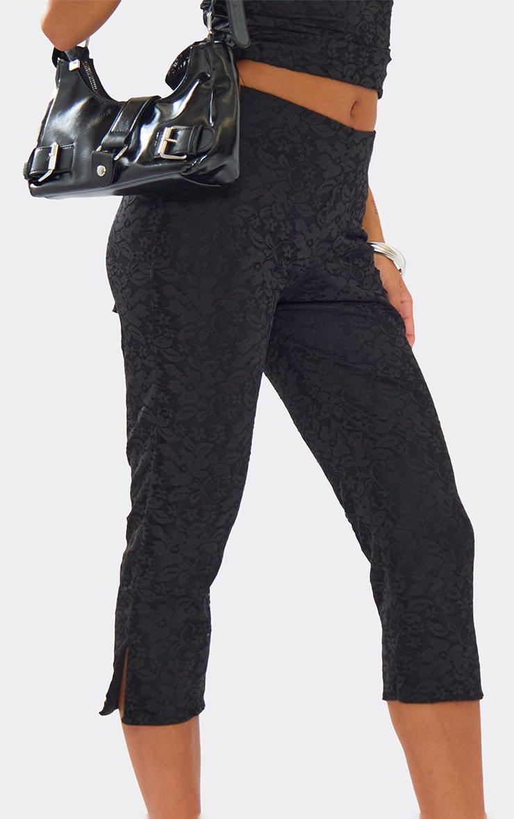 Mid Rise Split Hem Capri Leggings In Black Floral Lace