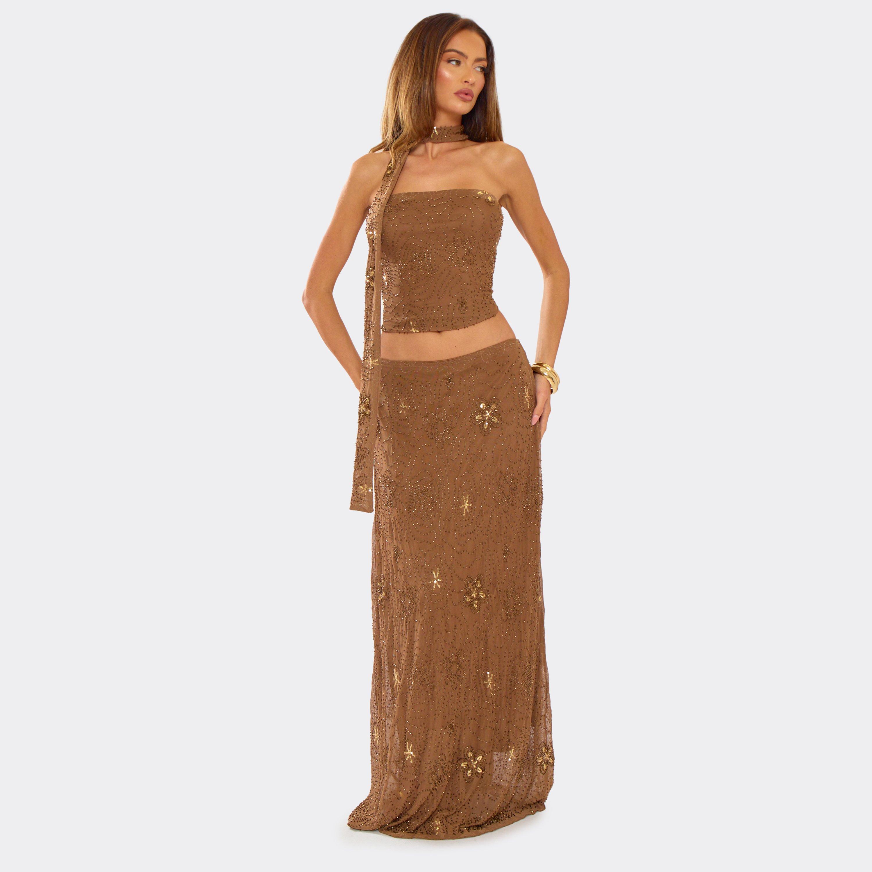 Bandeau Embellished Scarf Detail Top And Maxi Skirt Co-Ord Set In Brown