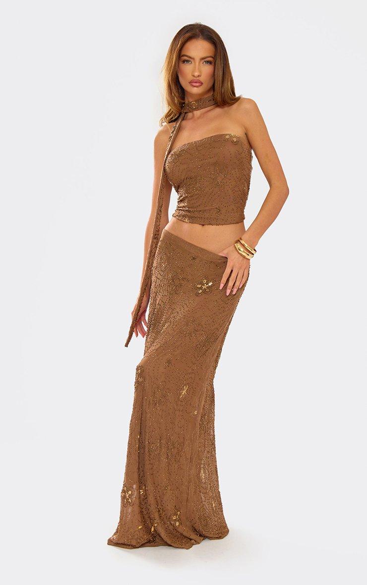 bandeau embellished scarf detail top and maxi skirt co-ord set in brown