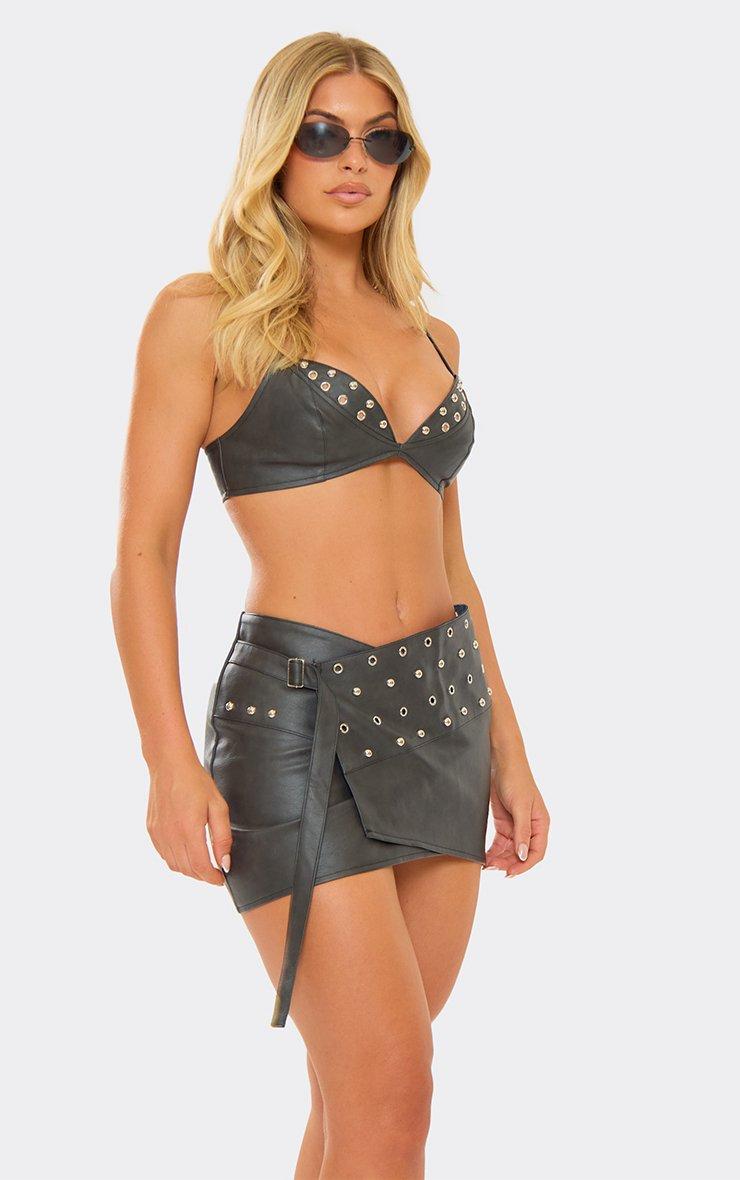 Strappy Eyelet Detail Bralet Top In Black Acid Wash Faux Leather