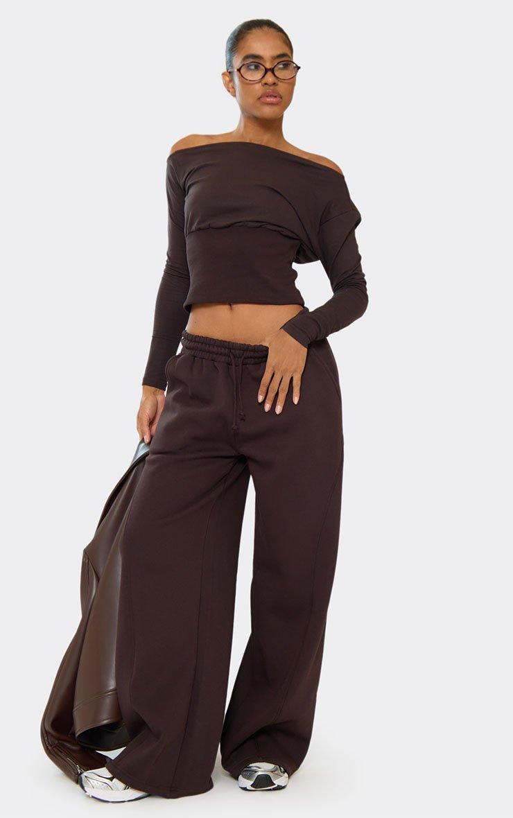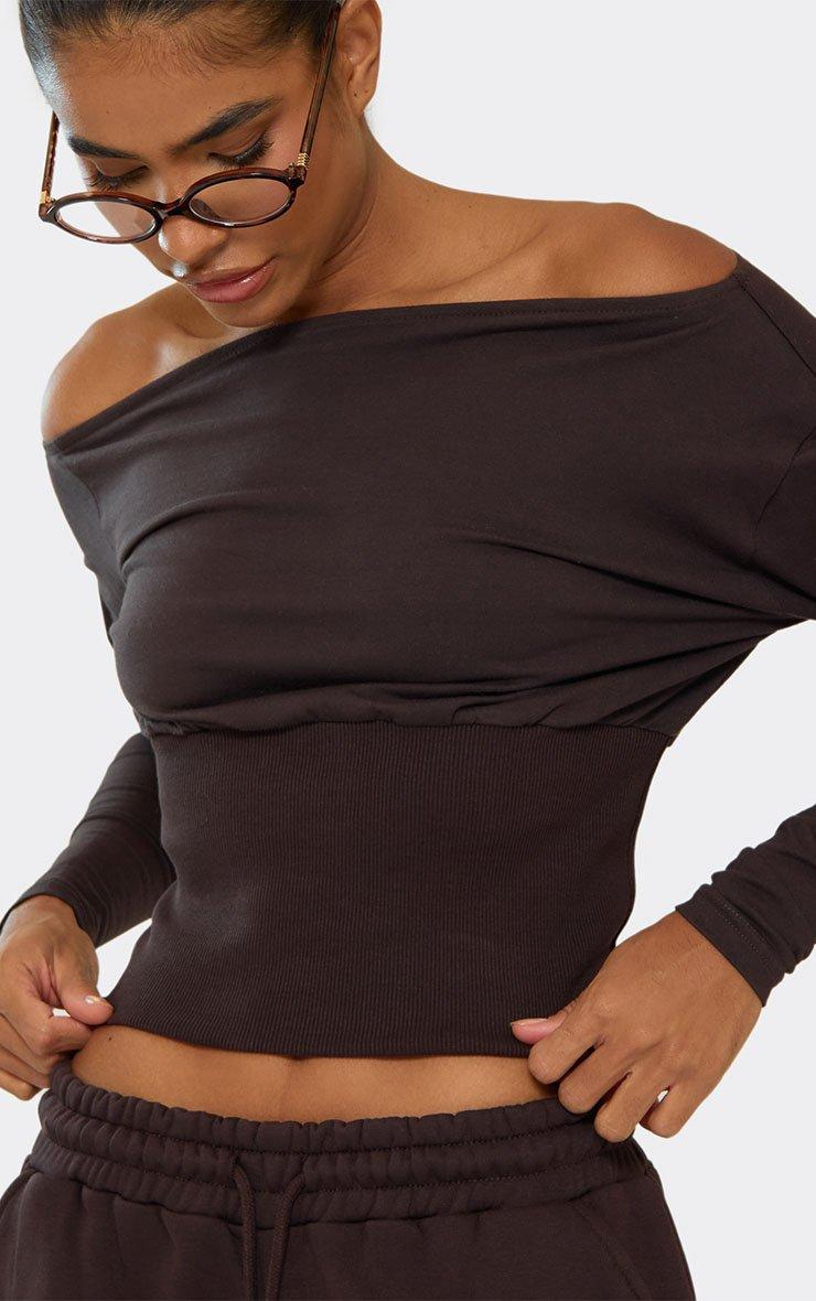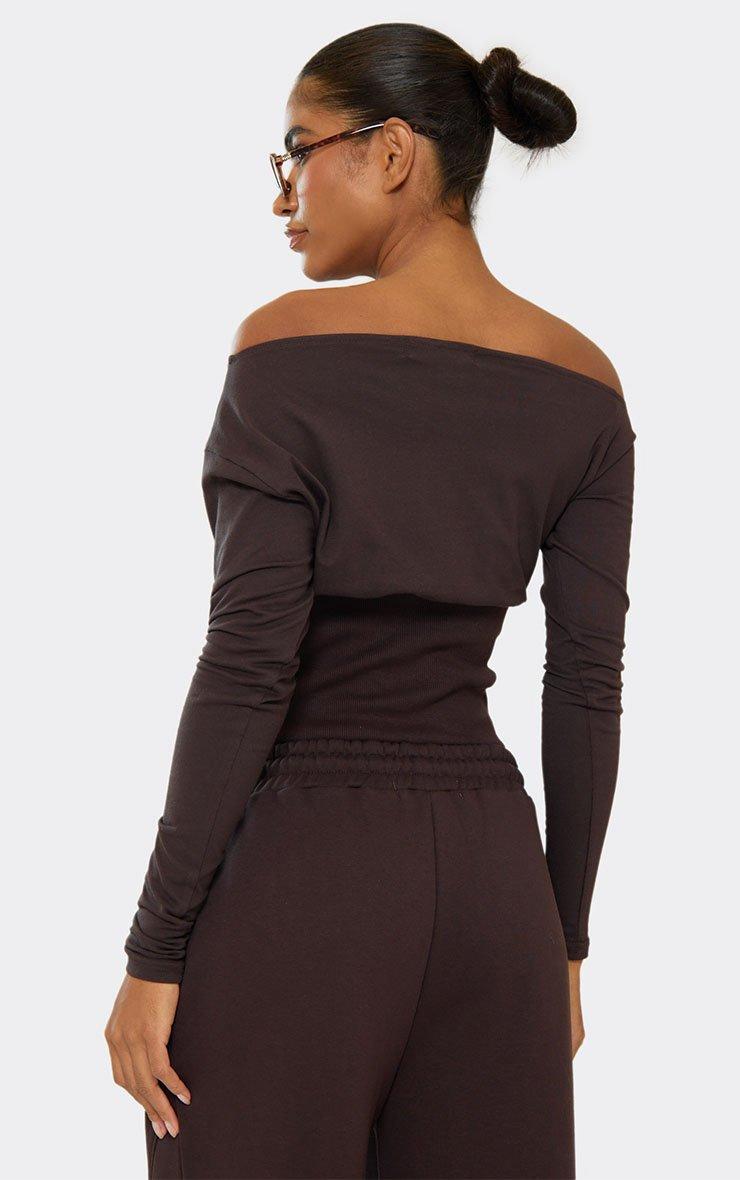 Long Sleeve Bardot Cinched Waist Top In Chocolate Brown