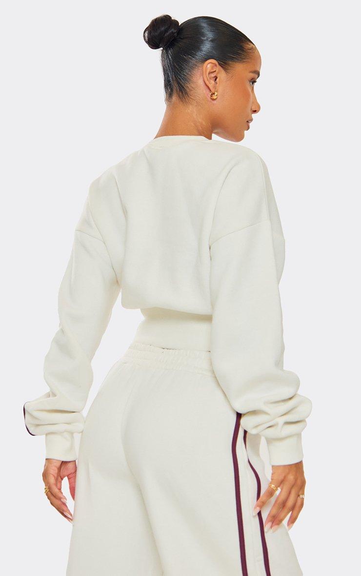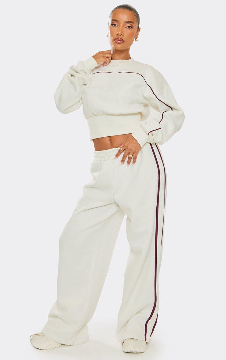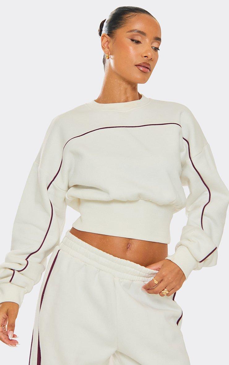 Long Sleeve Contrast Piping Detail Cropped Sweatshirt In Cream