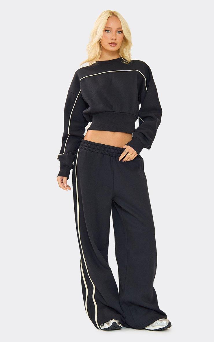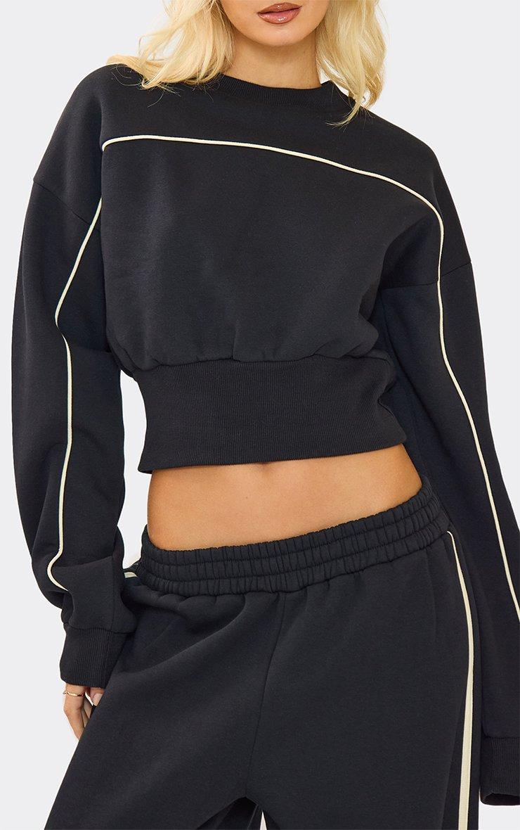 Long Sleeve Contrast Piping Detail Cropped Sweatshirt In Dark Navy Blue