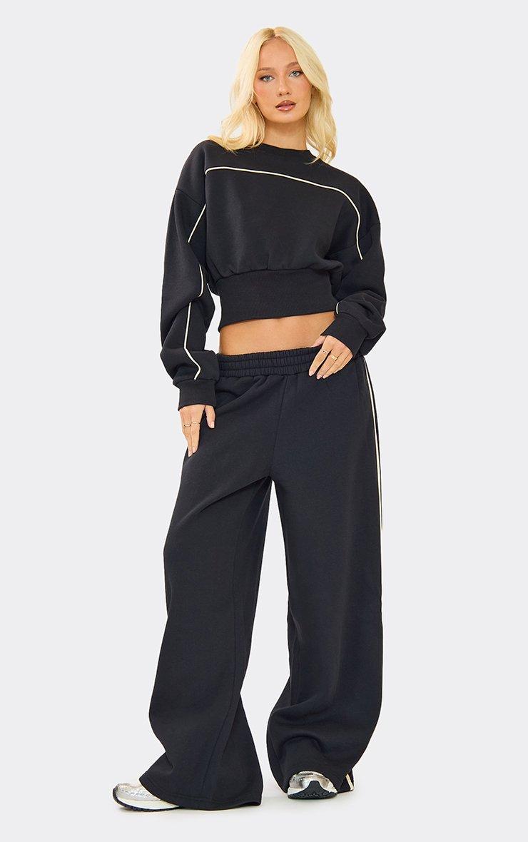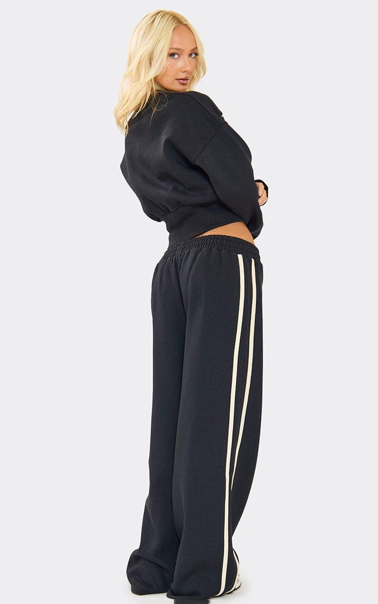 Mid Rise Contrast Piping Detail Wide Leg Joggers In Dark Navy Blue