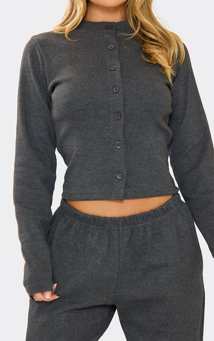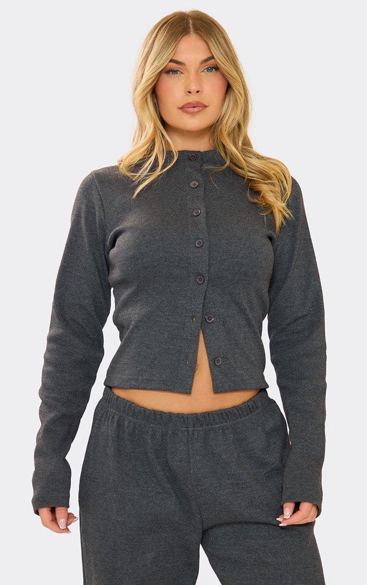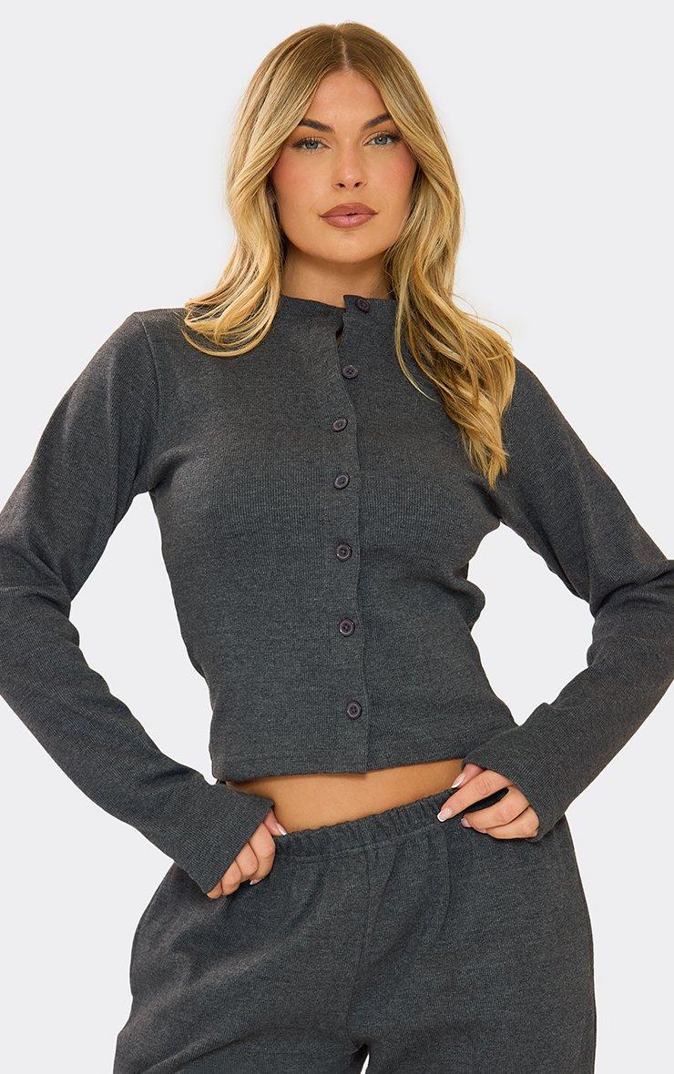 Long Sleeve Button Front Fitted Top In Charcoal Grey Ribbed