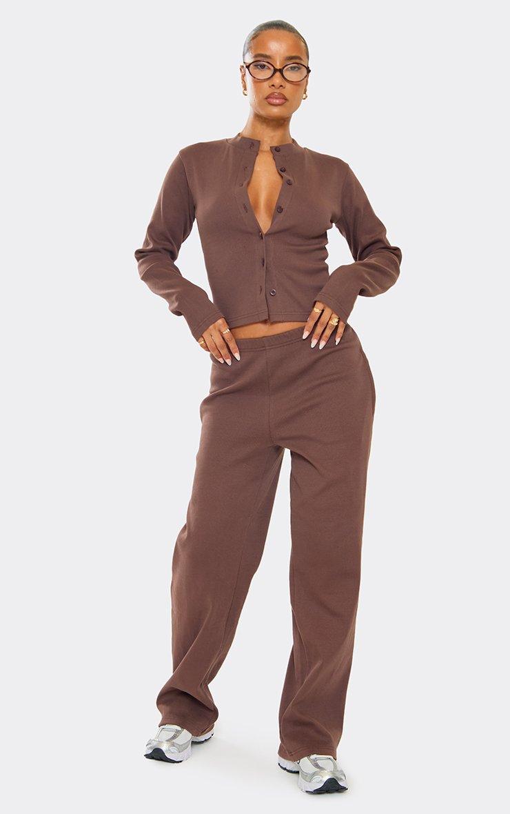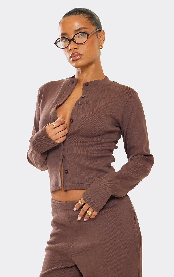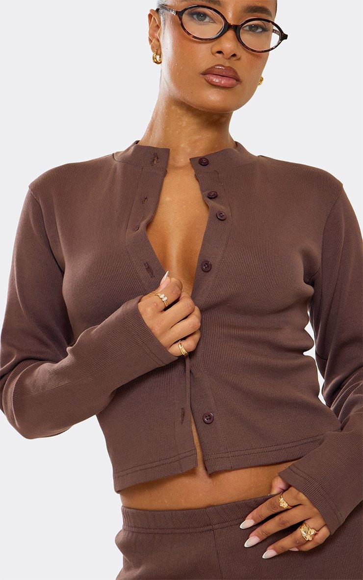 Long Sleeve Button Front Fitted Top In Chocolate Ribbed
