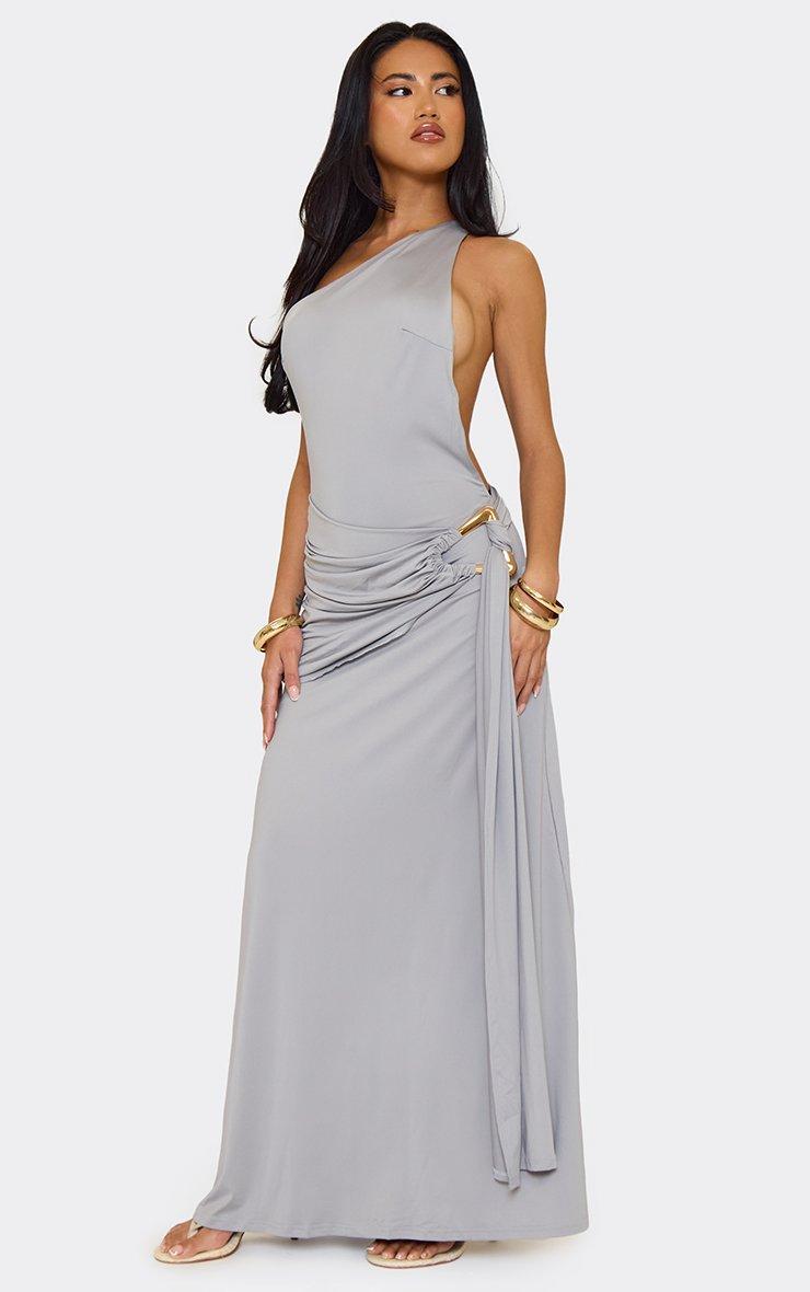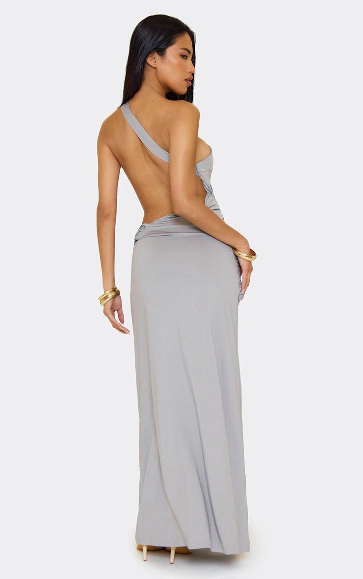 One Shoulder Open Back Trim Detail Maxi Dress In Grey