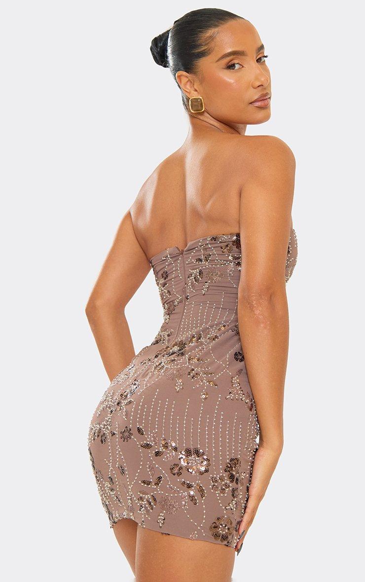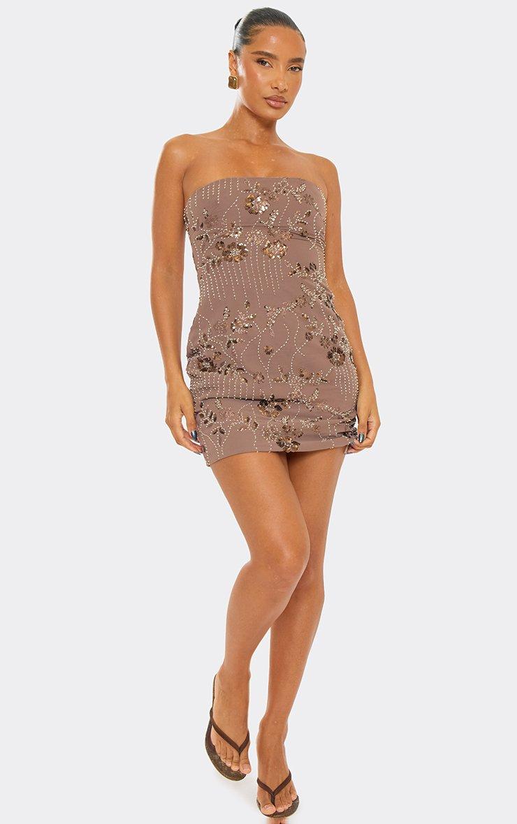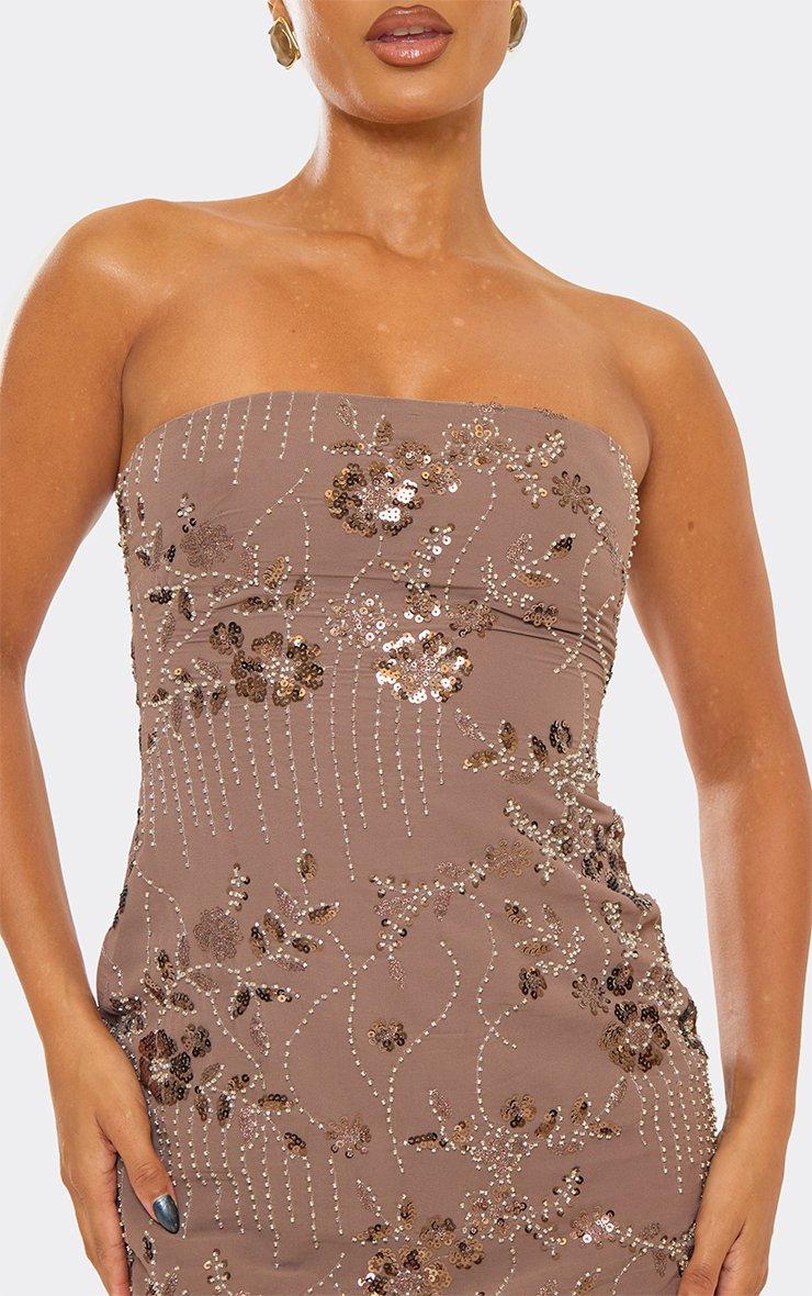 Bandeau Embellished Sequin Floral Mini Dress In Brown