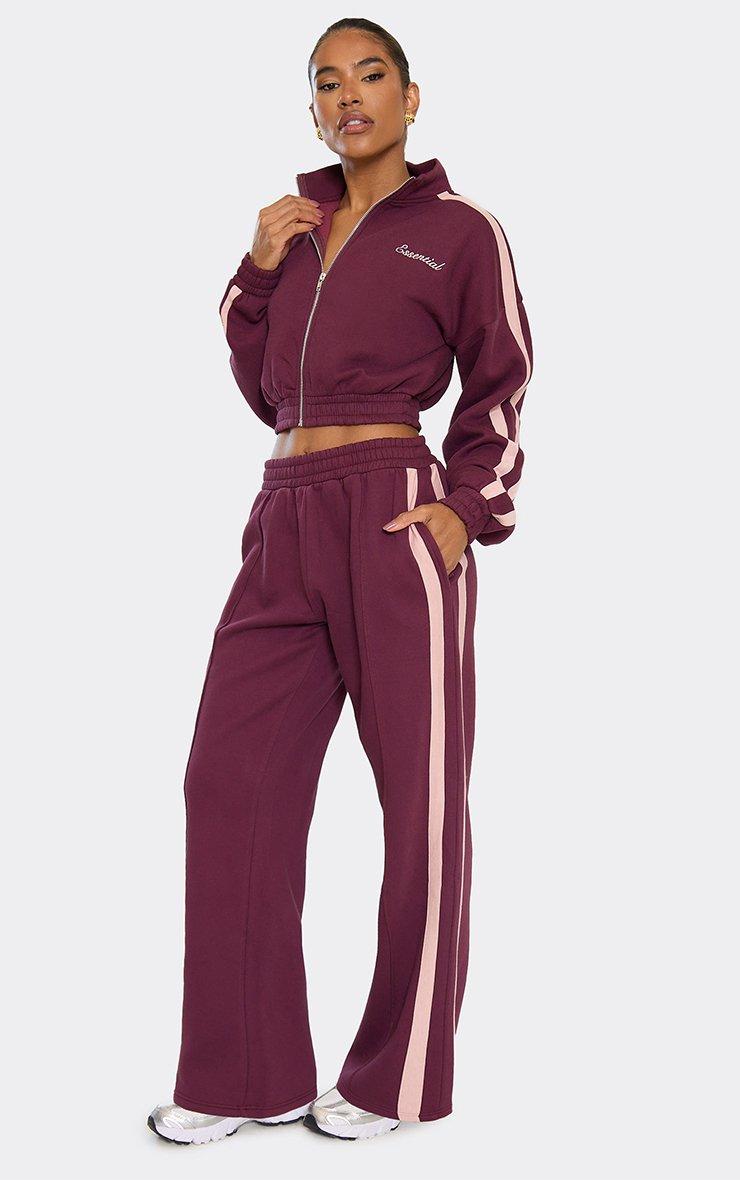 Oversized Tie Waist Contrast Stripe Wide Leg Joggers In Burgundy