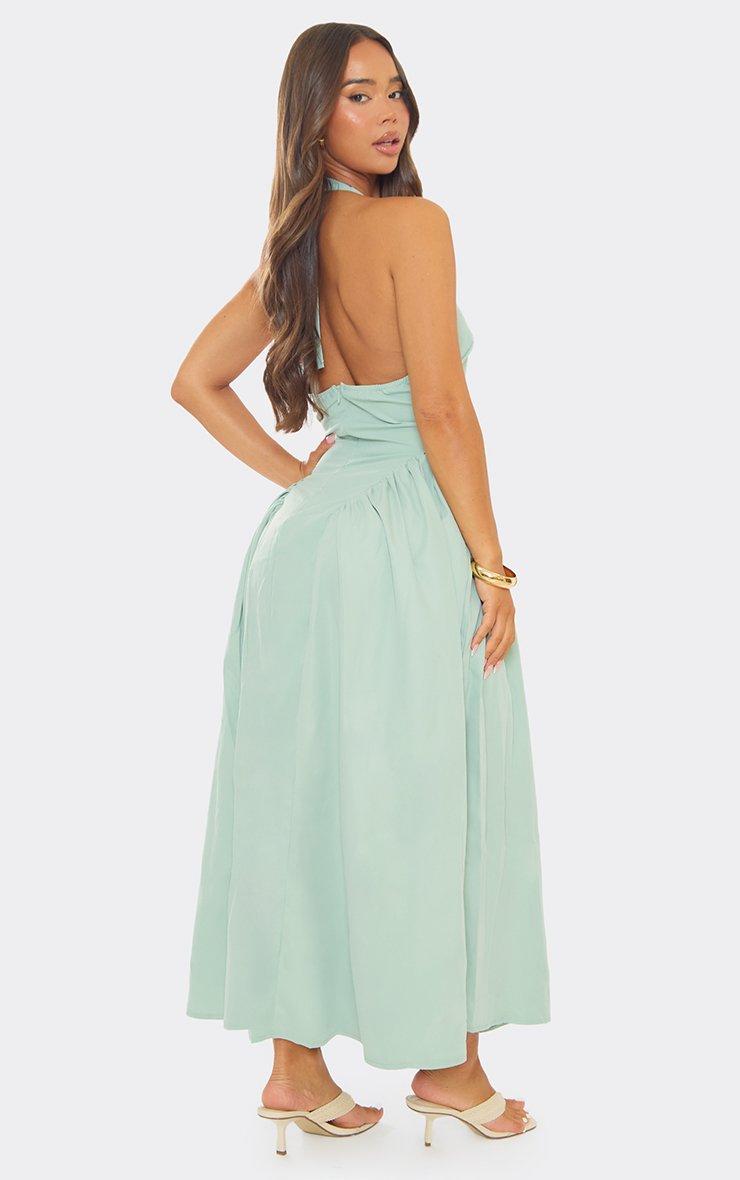 Halterneck Button Front Detail Mini Dress In Khaki Green Woven
