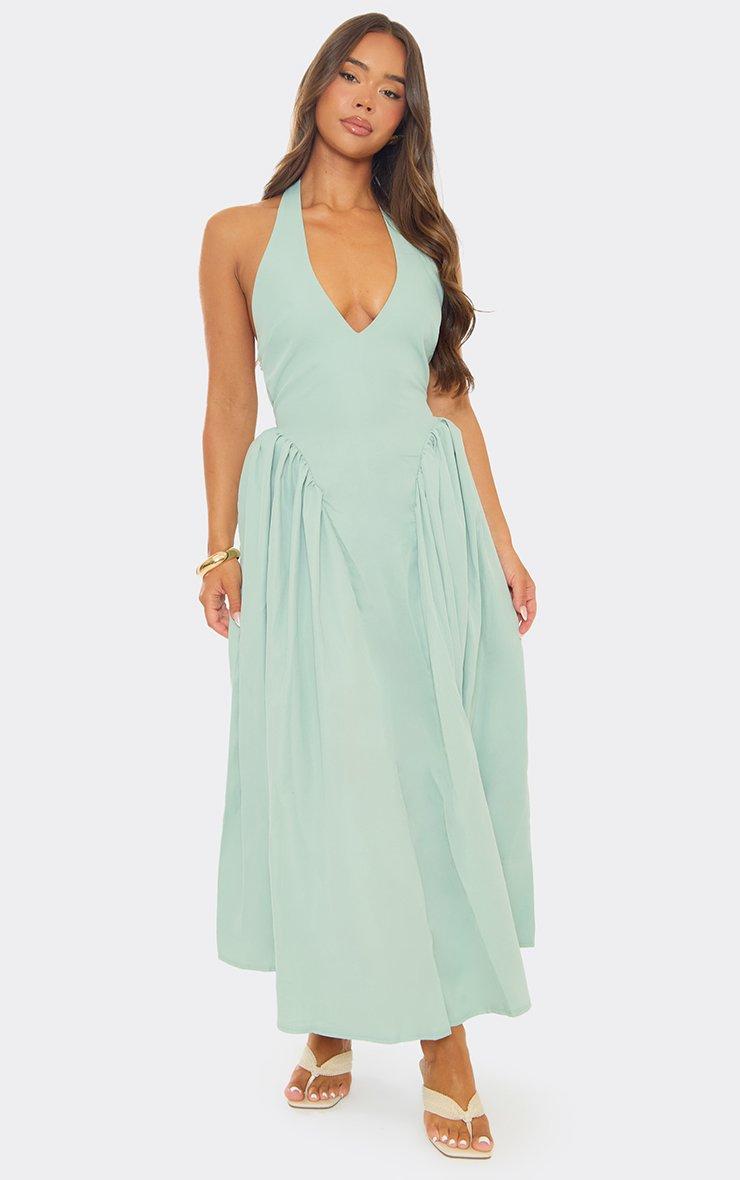 V Neck Dipped Waist Pleated Hem Midi Dress In Sage Green