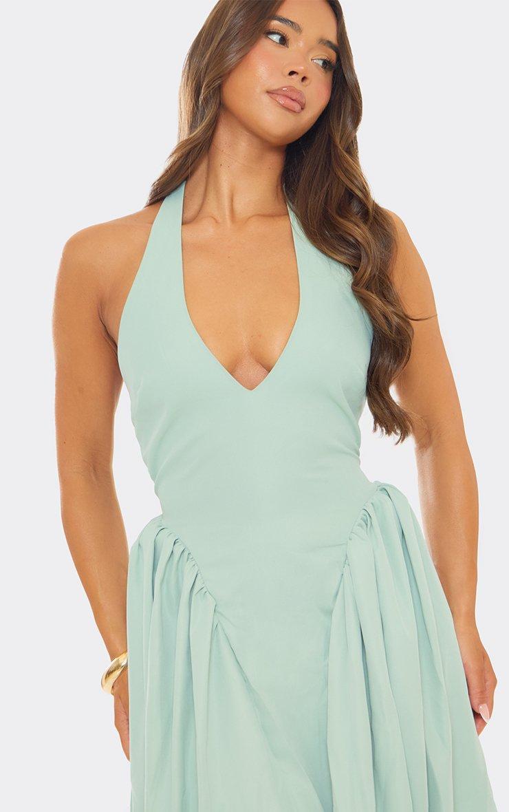 Plunge Halterneck Draped Front Mini Dress In Sage Green