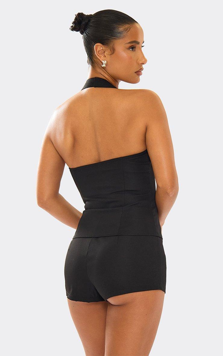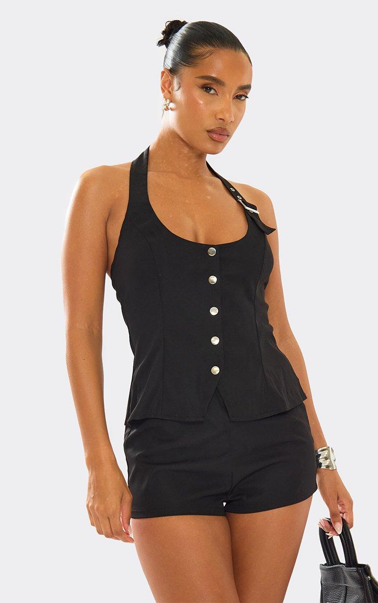 halter neck stud front belted strap top in black