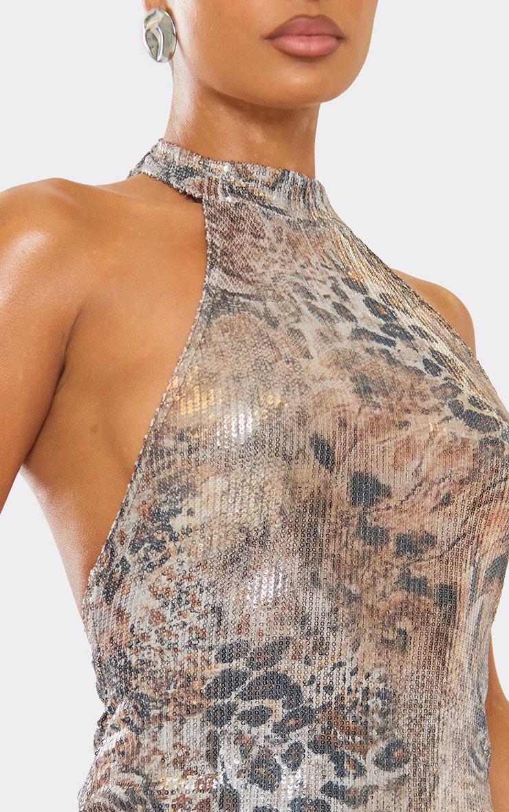 High Neck Fitted Mini Dress In Multi Animal Print Sequin