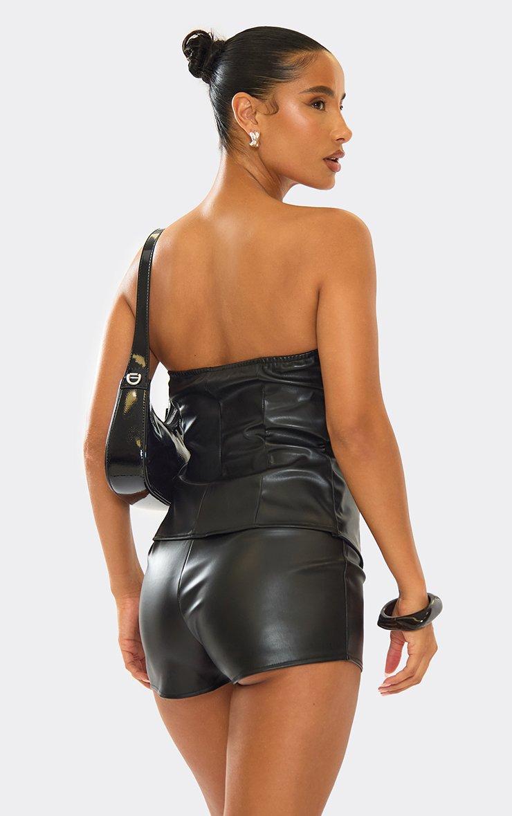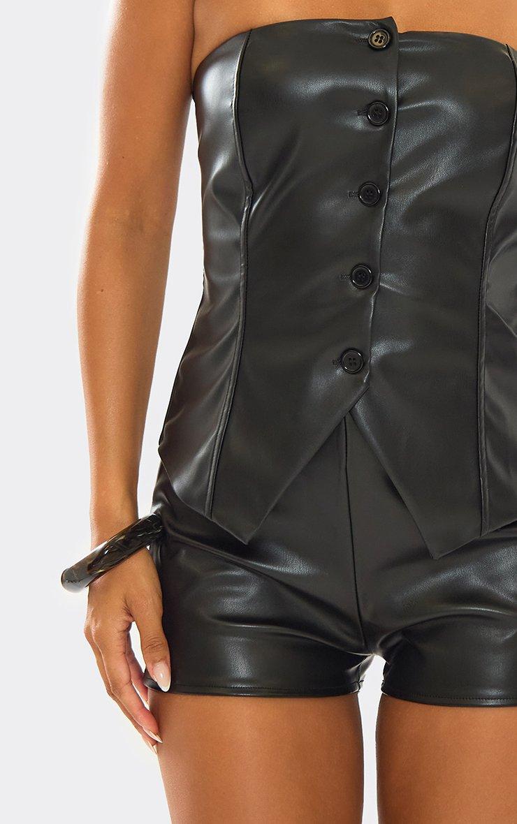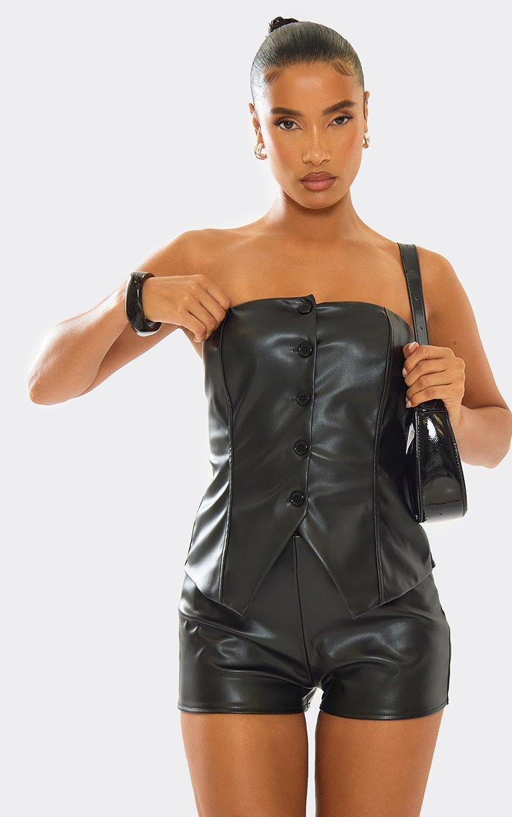 Bandeau Button Up Front Fitted Top In Black Faux Leather