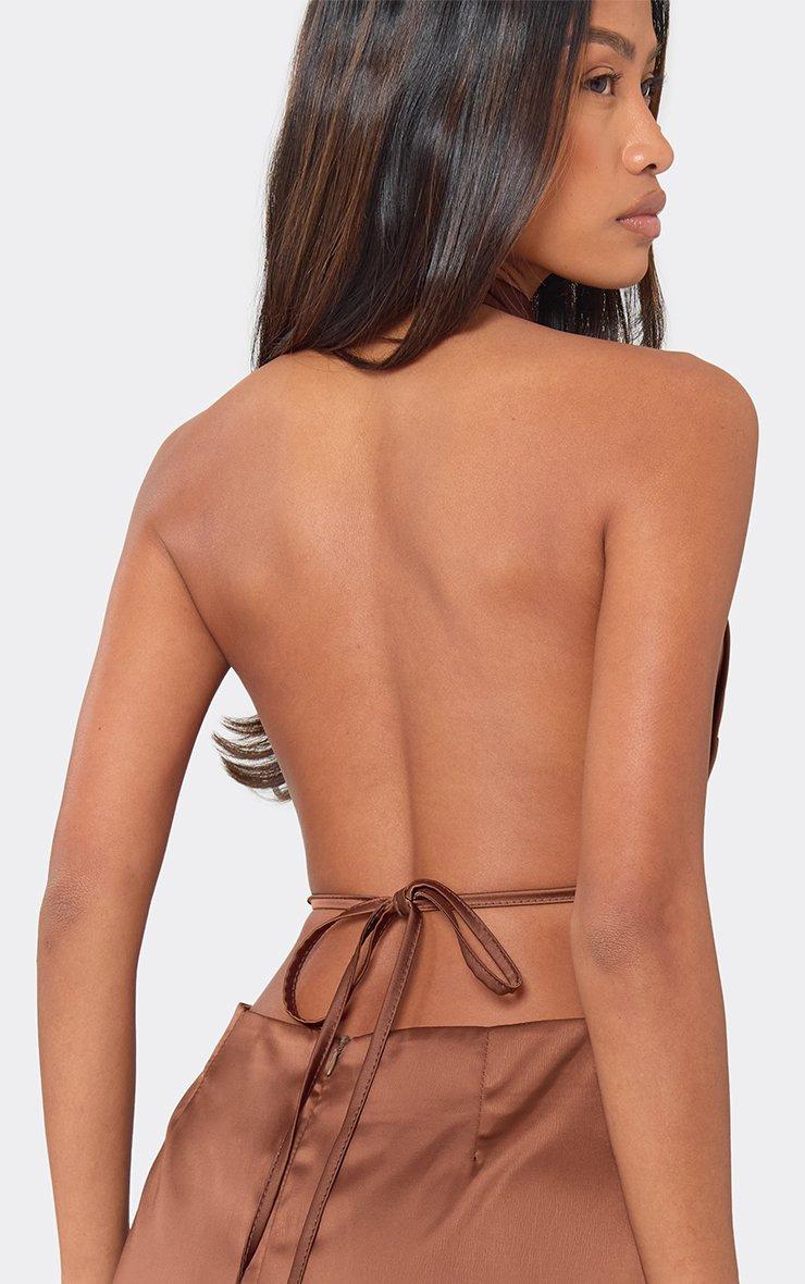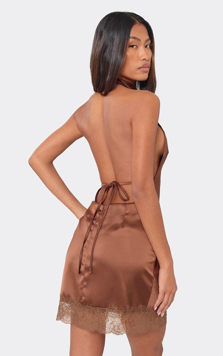 Hight Neck Low Back Lace Trim Detail Mini Dress In Brown Satin
