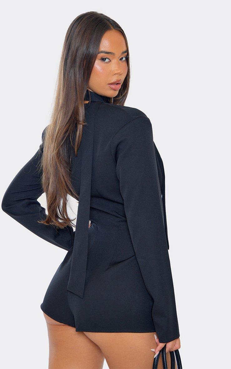 Tie Neck Plunge Blazer Detail Playsuit In Black