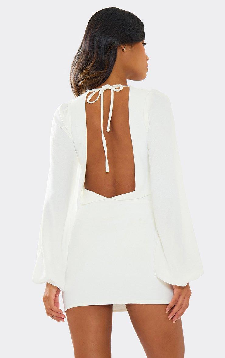 Cowl Neck Blouson Sleeve Mini Dress In White Linen
