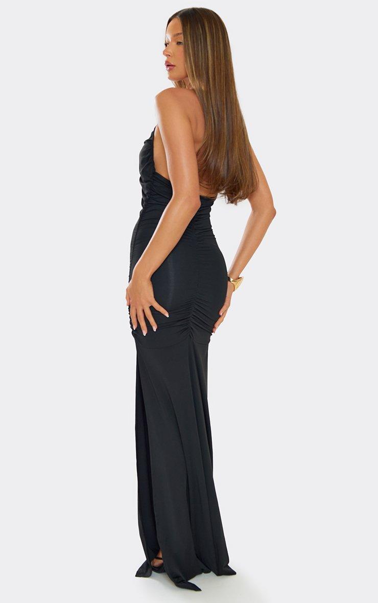 Extreme Plunge Halterneck Ruched Detail Maxi Dress In Black