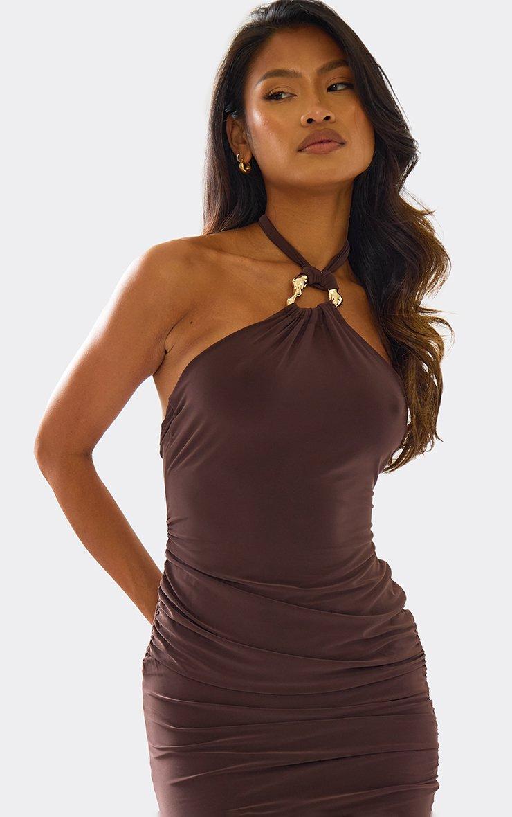 Halterneck O Ring Drape Detail Mini Dress In Chocolate Brown
