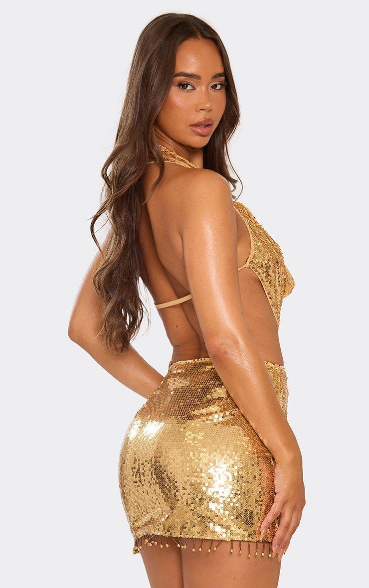 Extreme Plunge Halterneck Bodycon Mini Dress In Gold Disc Sequin