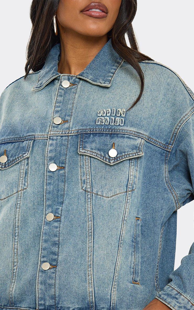 Long Sleeve Oversized Min Min Detail Jacket In Washed Blue Denim