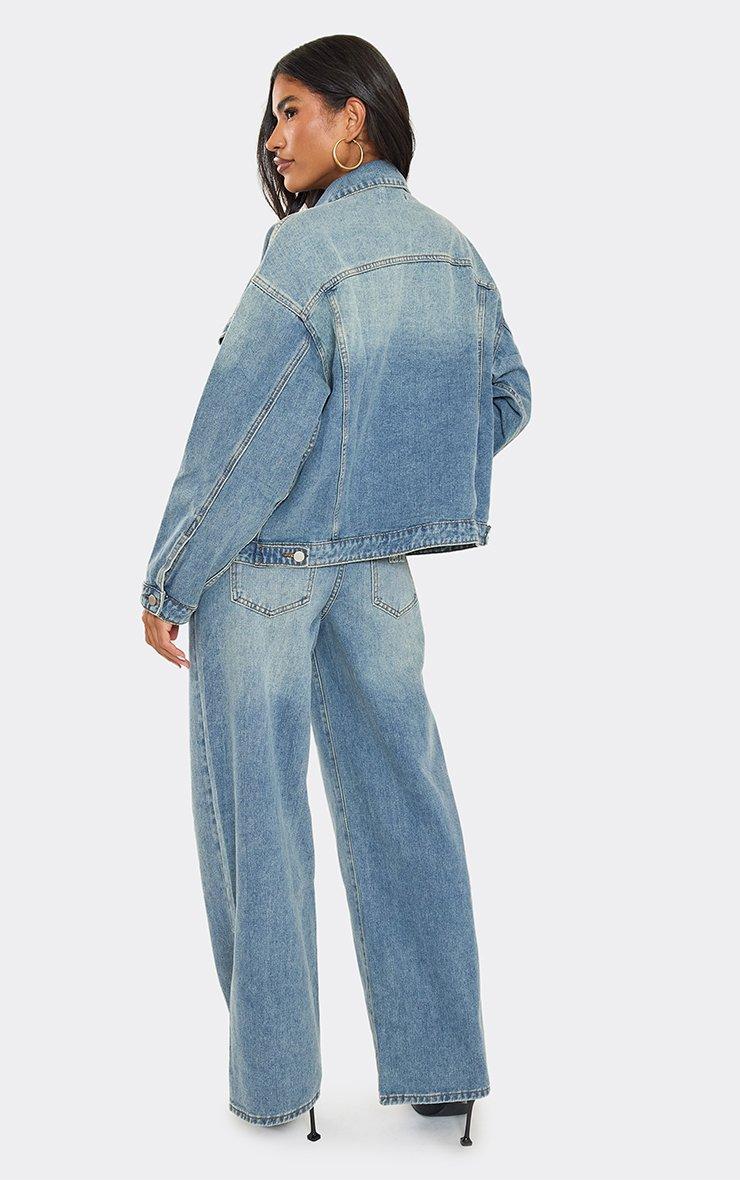 Long Sleeve Button Pocket Detail Cropped Jacket In Blue Wash Denim