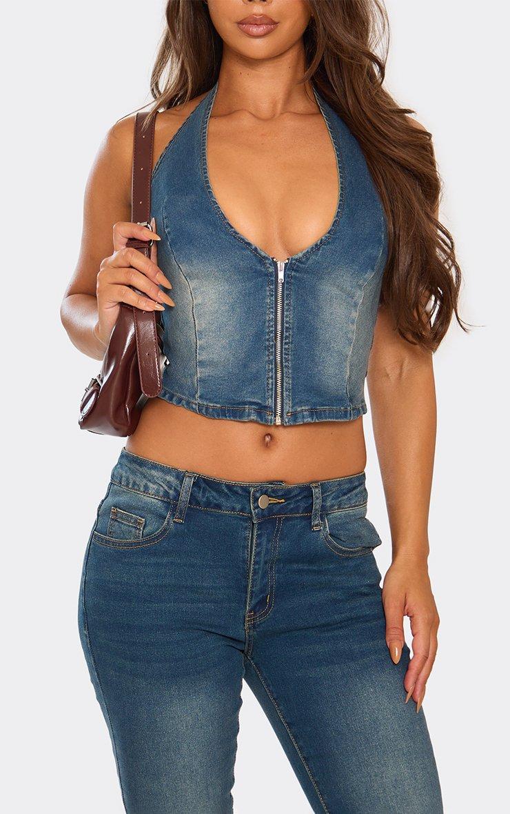 Plunge Halterneck Hook And Eye Detail Corset Top In Indigo Blue Denim