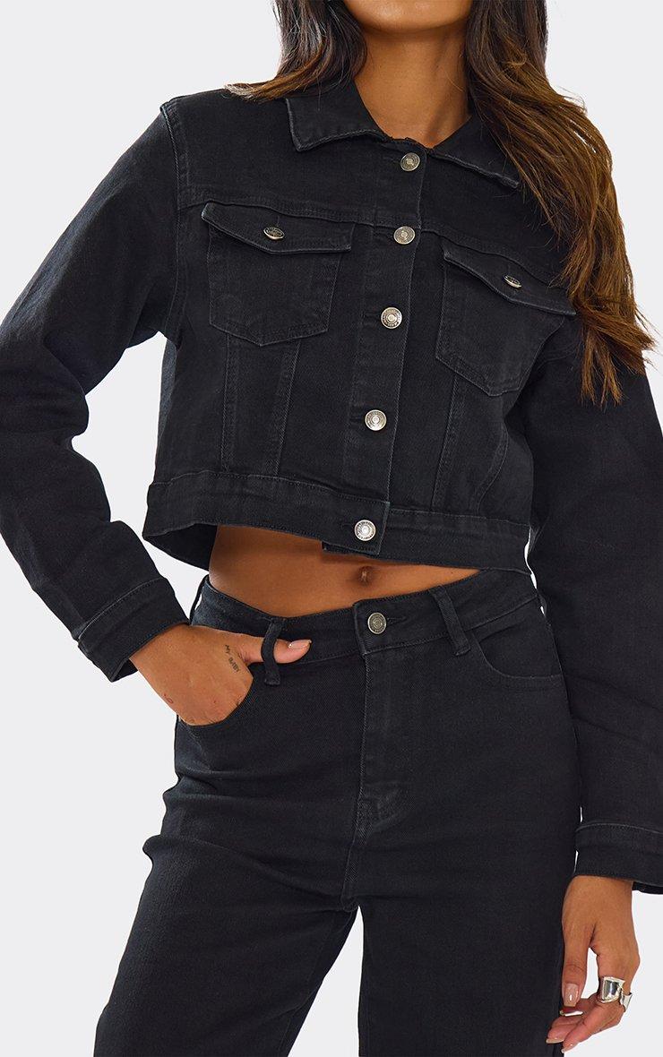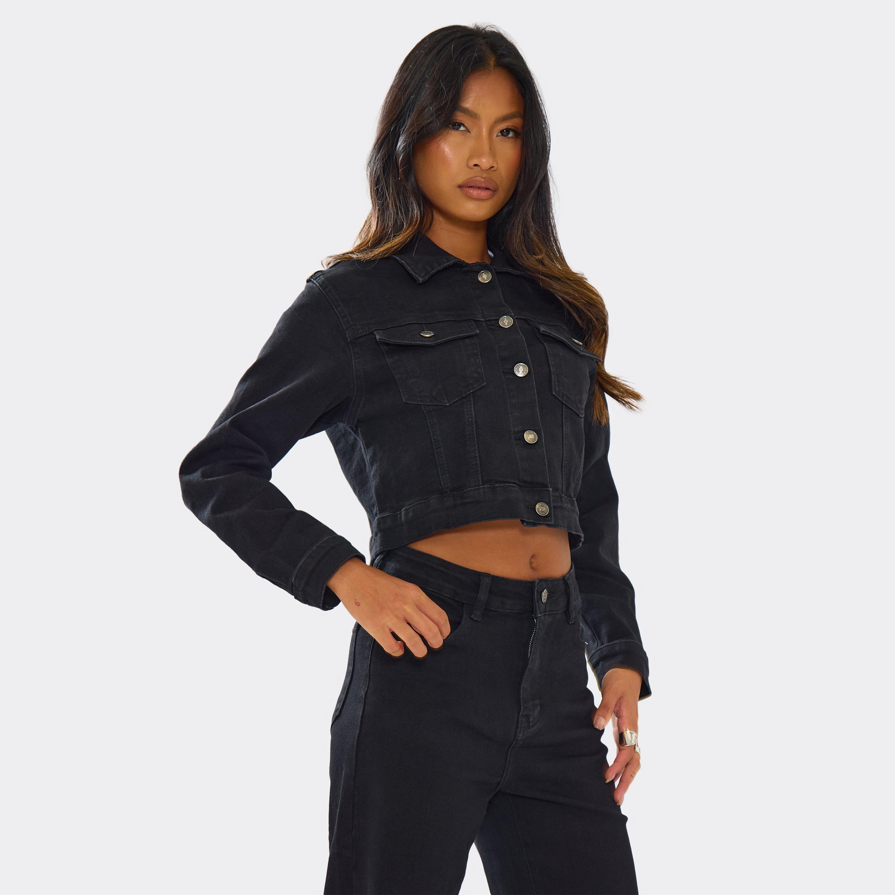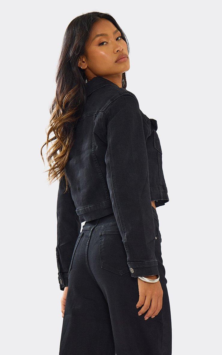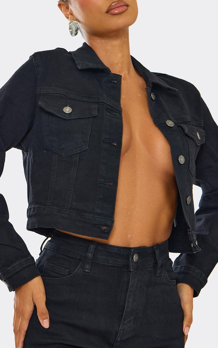 Long Sleeve Button Down Detail Cropped Jacket In Black Denim