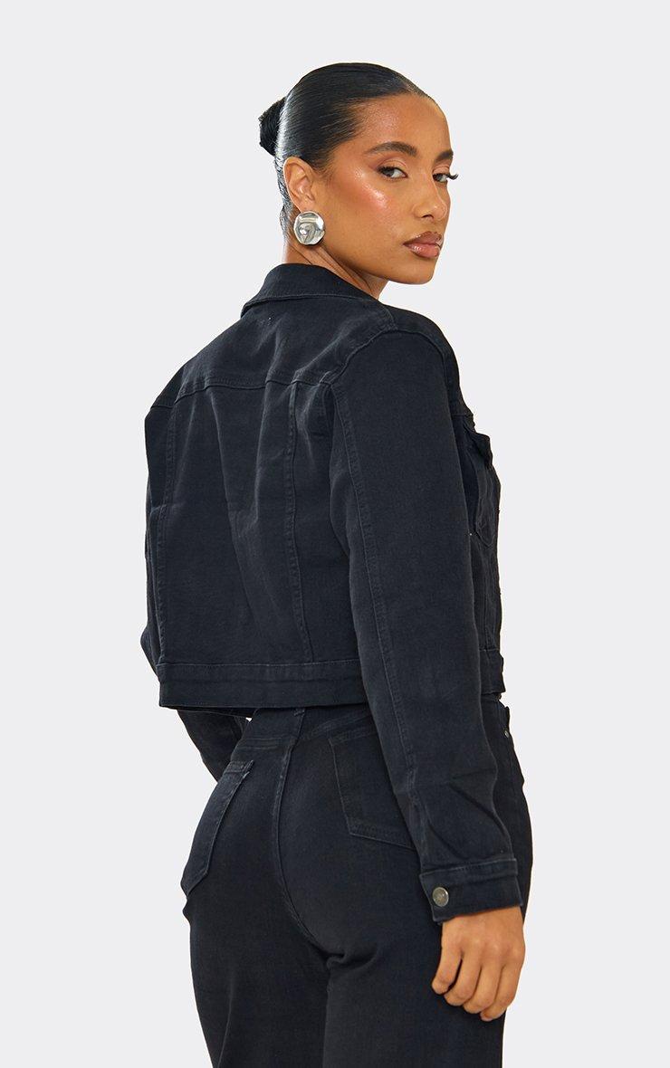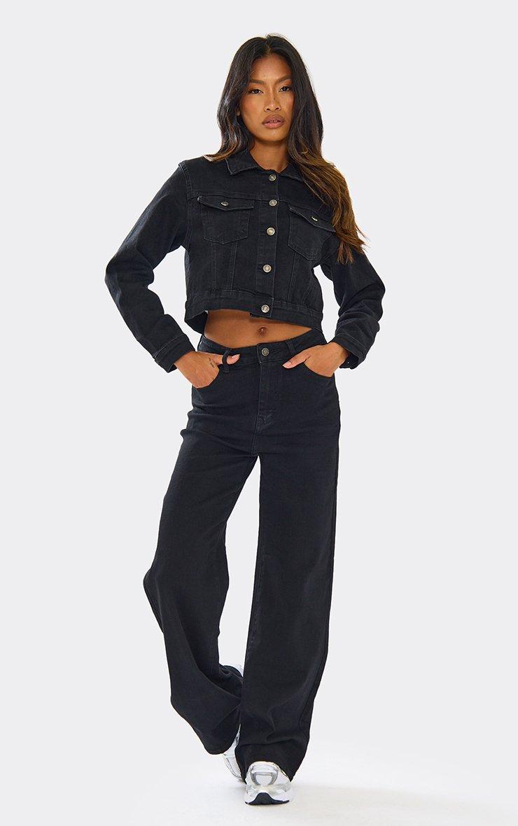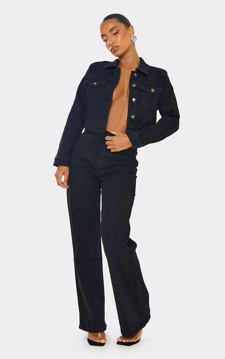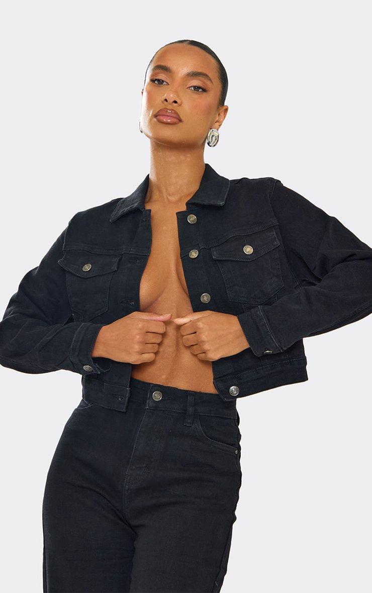 Long Sleeve Button Down Detail Cropped Jacket In Black Denim