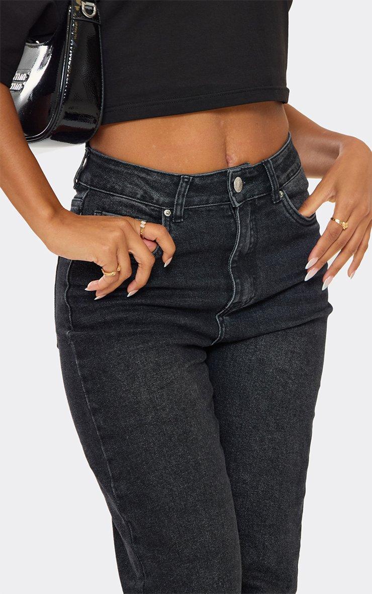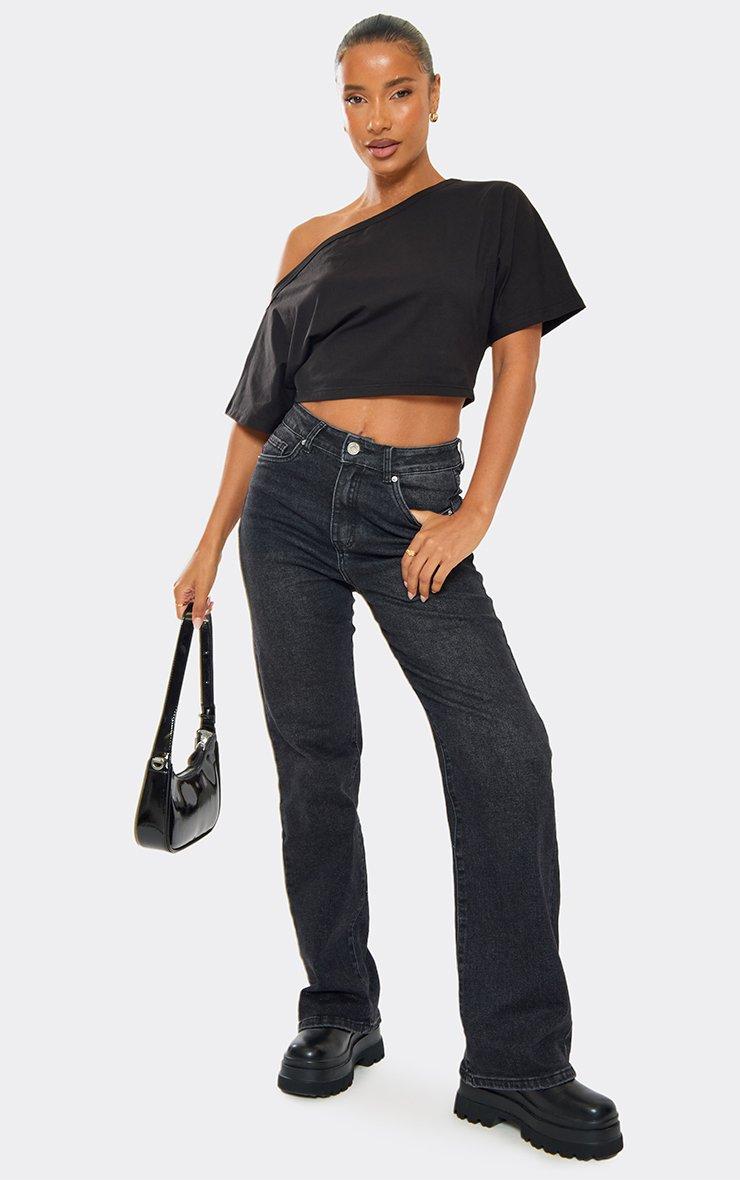 Mid Rise Zip Detail Wide Leg Jeans In Washed Black Denim
