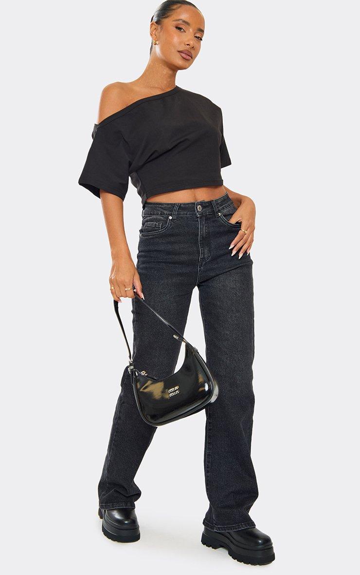 Low Rise Carpenter Seam Detail Wide Leg Jeans In Black Denim